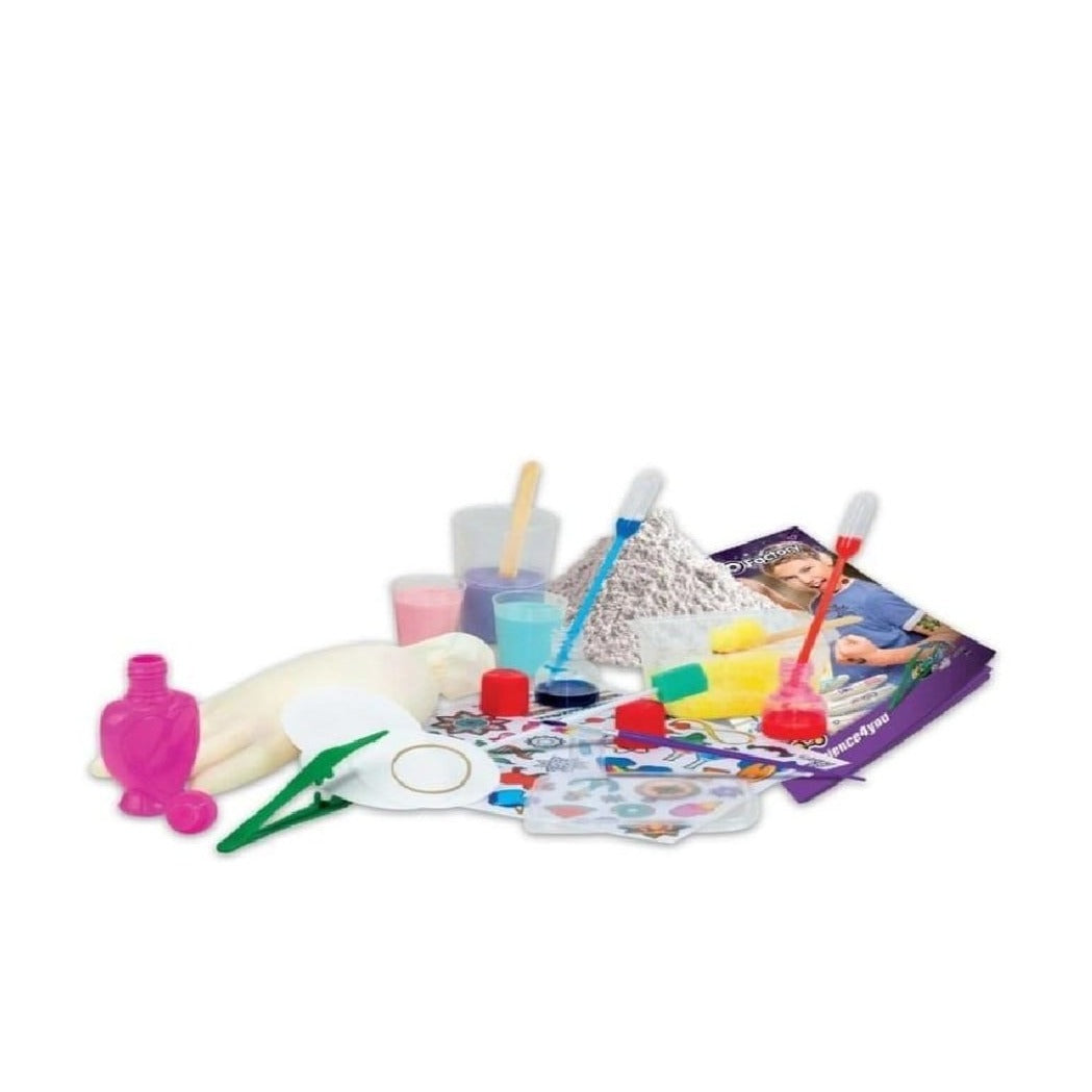 Are you ready to live this scientific adventure? Explore the world of science and art while doing amazing tattoos on a plaster sculpted hand; with the tattoo factory, the little scientist will learn how to make amazing tattoo stencils, how to create a tattoo studio and prepare their own inks, and much more; tattoo factory, has 8 experiments and an educational book with 36 pages so you can learn all about your tattoos; one of our main concerns is for children to play and have fun with safe products, so all of our products comply with all EU cosmetics regulations and European toy directives (en71); this set was developed by a team of children scientists and educators; it has been an event among the youngest ones; in addition to direct learning, the lipstick factory helps children improve their concentration levels. , creativity and reasoning; contents of the book kit, paper filters, gloves, measuring cups, elastic rubber, pasteur pipettes, spatulas, adhesive tattoos, brush, sponge, dyes, containers with lids, tweezers, heart, and plaster.