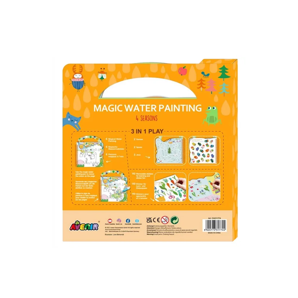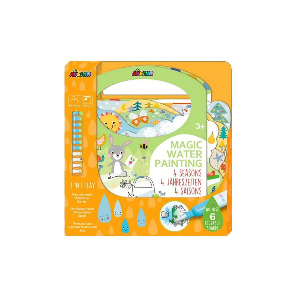 كتاب تلوين Avenir Magic Water Painting - 4 Seasons، هو كتاب تلوين في عبوة عملية بمقابض، حتى تتمكن من حمله بسهولة! سيبقى أطفالك مشغولين طوال اليوم! يمكنهم رسم الصور مرارًا وتكرارًا، فقط عن طريق ترطيب الفرشاة بقليل من الماء. بمجرد أن تجف الورقة، يختفي اللون من أجل متعة متكررة! مع الألغاز الإضافية المخفية داخل الكتاب، نعدك بأنك لن تشعر بالملل أبدًا! , , يتضمن كل كتاب 6 أسطح تلوين قابلة لإعادة الاستخدام وورقتين من الملصقات القابلة لإعادة الوضع للأنشطة ذات الطابع الخاص وقلم ماء قابل لإعادة التعبئة. املأ قلم الماء بماء الصنبور العادي، ثم ارسم للكشف عن اللون الموجود على الصفحات - سيختفي عندما يجف الماء، ثم يمكنك البدء من جديد، تمامًا مثل السحر! لمضاعفة المتعة، أضفنا الكثير من الأنشطة لإلهام التعلم والاستكشاف والخيال لدى الأطفال بشكل أكبر! تصميمات سهلة الحمل في أي مكان - رسوم توضيحية وأسلوب رائع - الرسم بالماء يعني عدم الفوضى - العب بملصقات إعادة الوضع وتعلم - لعبة المتاهة - ابحث واعثر.