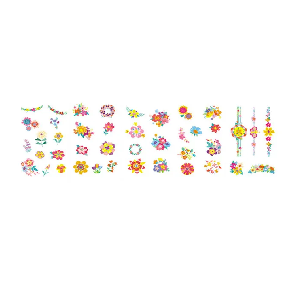 تتضمن المجموعة ورقتين من الوشم المؤقت وورقة واحدة من ملصقات الأظافر، تتميز جميعها بتصميمات عالية الجودة ومصممة بحب على شكل زهور.