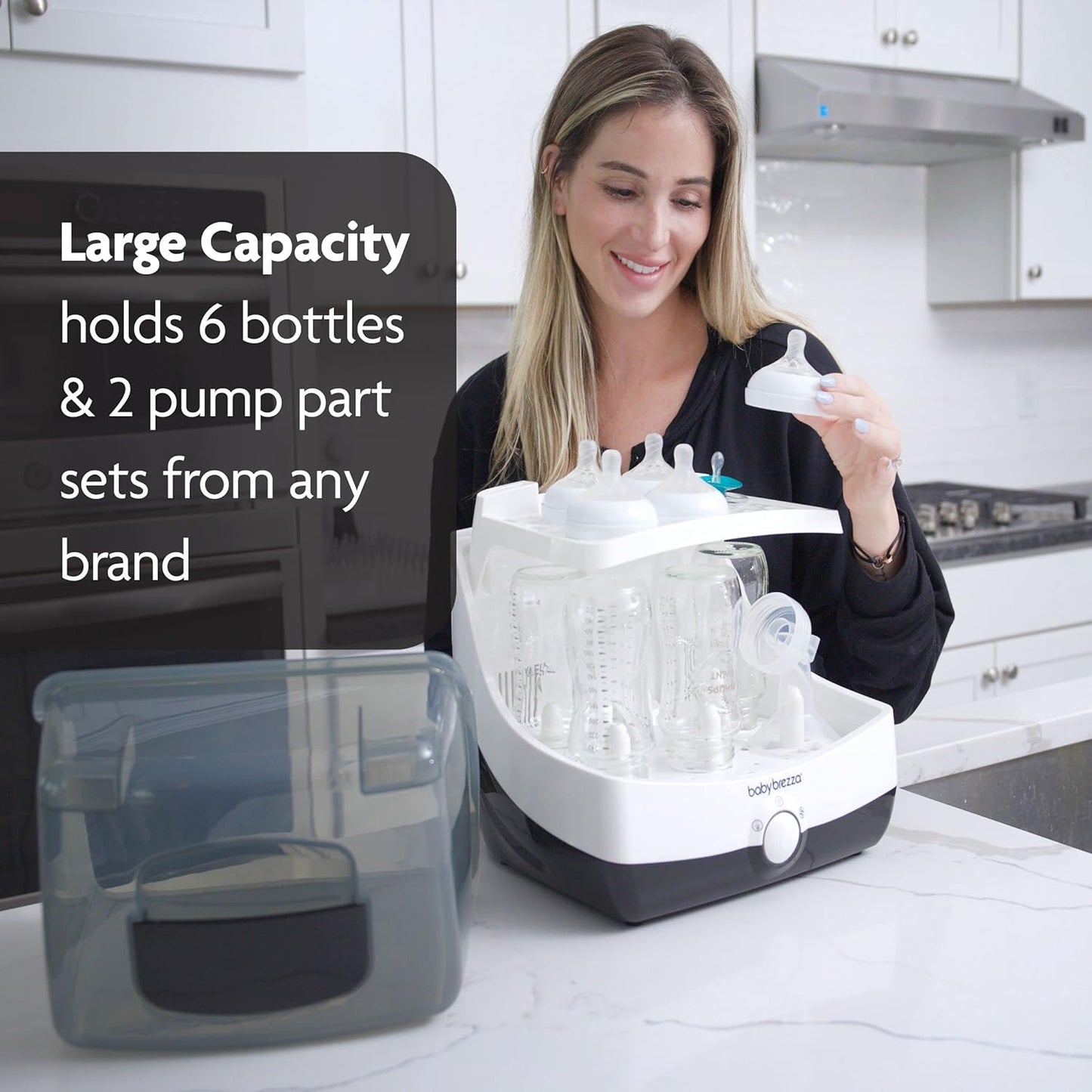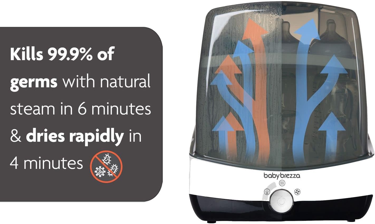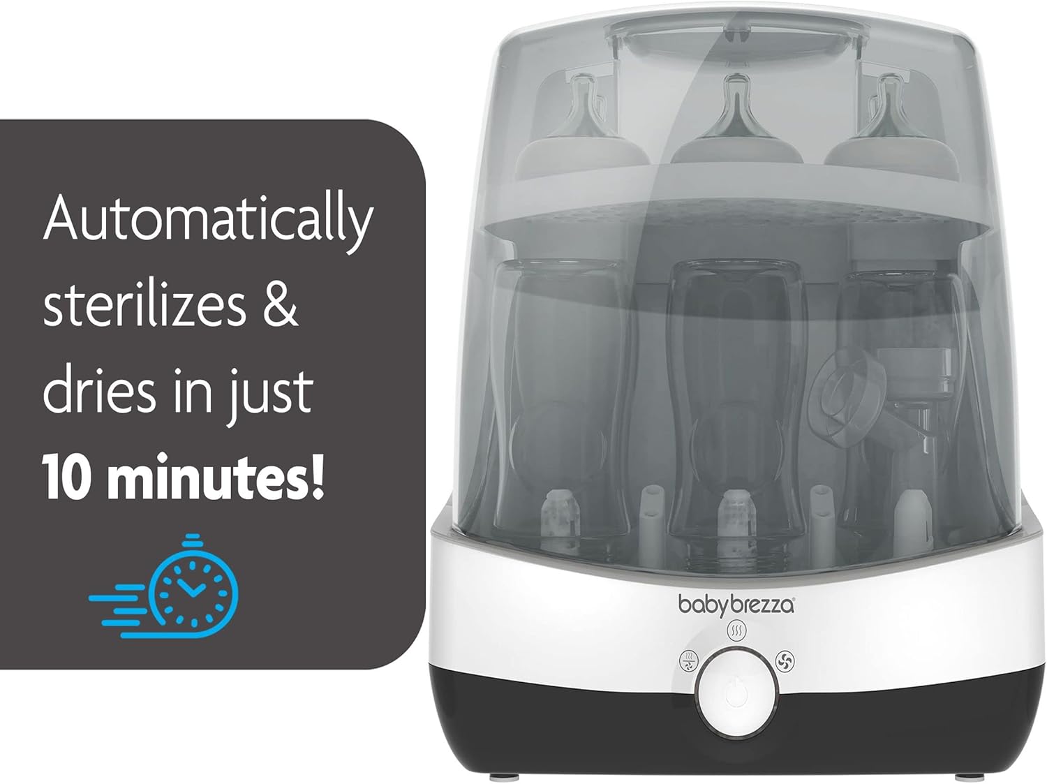 The Baby Brezza SuperFast Sterilizer Dryer is the fastest sterilizer dryer. In just 10 minutes, it automatically sterilizes and dries bottles, pump parts and accessories – it’s 75% faster than other sterilizer dryers so no pre-planning is necessary. It uses natural steam to kill 99.9% of germs, then automatically dries with hot air. Products remain sterilized inside for up to 24 hours. It holds 6 bottles, pump parts and accessories from any brand and has a single push button that is easy to use and select from 4 different functions (Sterilize & Dry; Sterilize Only; Dry Only; Storage Rack). Say goodbye to boiling and say goodbye to sterilizing and drying SUPERFAST! BPA-FREE. 1-year limited warranty.