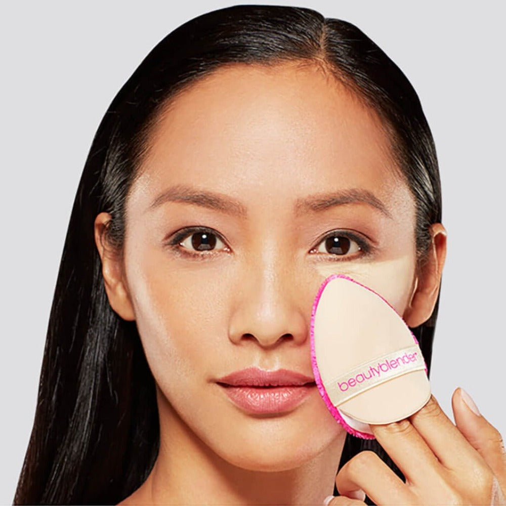 Slide your fingers into the puff's pocket at the bottom. Using the soft, plush side, pick up and apply your powder product of choice to your face, lightly dabbing into your skin. Flip the puff and blend further with the velvet-suede side for a seamless finish. Use the targeted tip for smaller corners and areas like the sides of your nose.