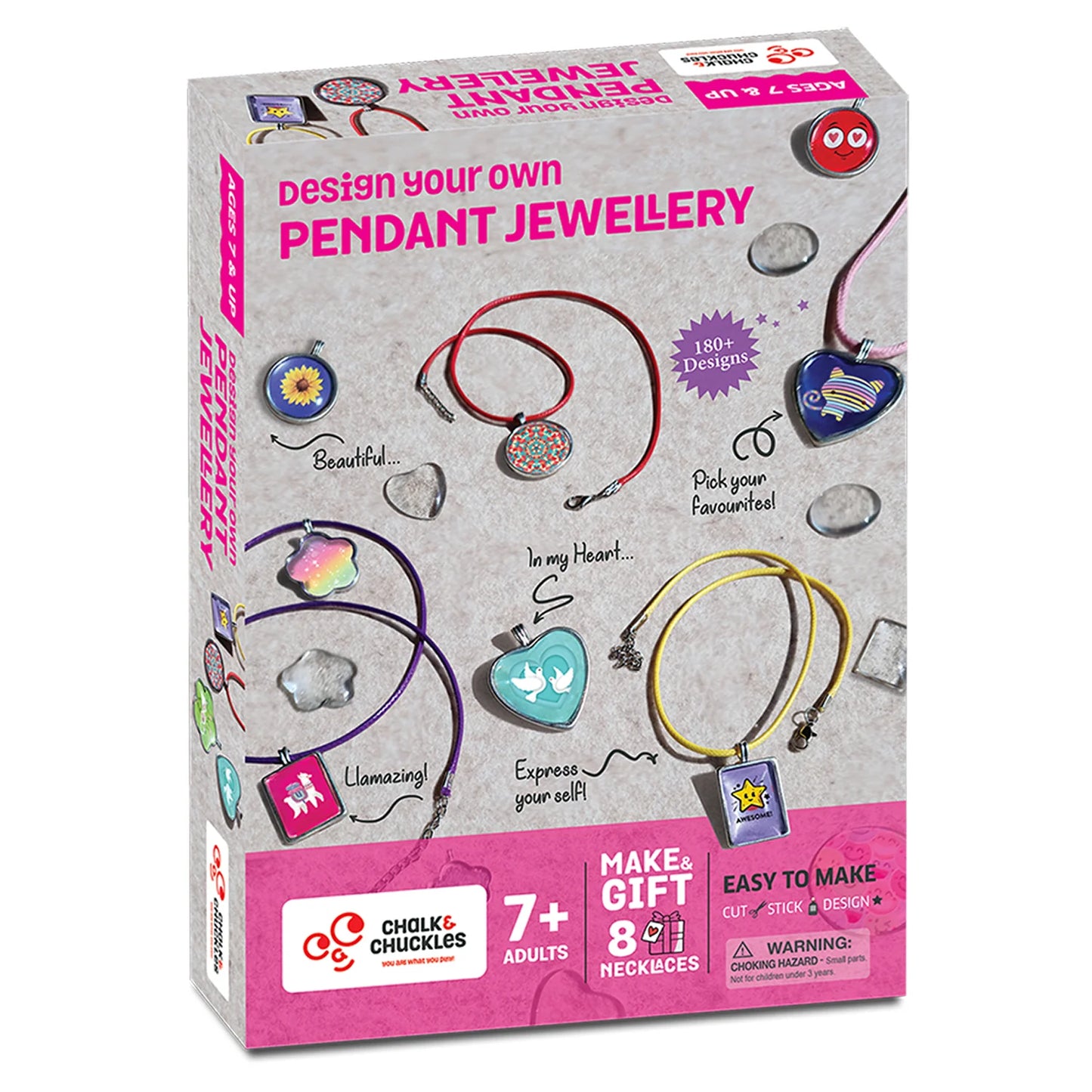 8 metal pendant trays + 8 clear glass cabochon tiles in 4 Unique shapes ( Heart, Star, Circle & Rectangle) + 8 Cotton Multi-coloured Necklaces with stong, flexible clasps + Craft glue + 8 Gift bags + 8 Gift tags + Design booklet with over 180+ images and detailed instructions.