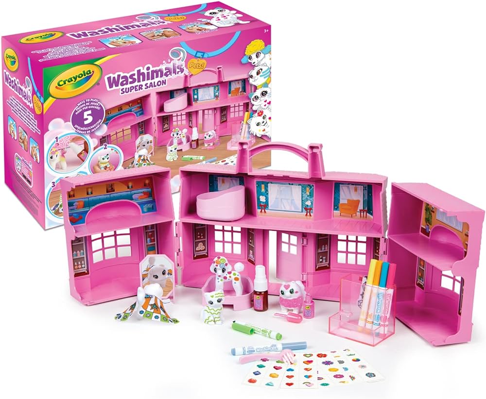 شخصيات اللعبة ومجموعة اللعب: تتضمن صالون كبير يعمل أيضًا كحل تخزين، 4 حيوانات أليفة، 6 أقلام تحديد، زجاجة رذاذ معطرة، 3 أوراق ملصقات قابلة للغسل، وزجاجة طلاء لؤلؤية.