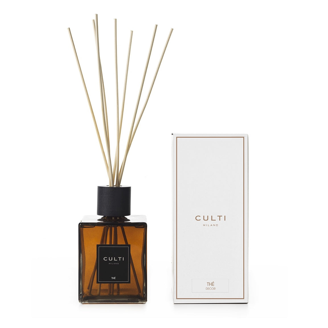 The Culti Décor collection adds a touch of character to any room with its bold, distinct features. Featuring a delectable scent presented in a sculpted square bottle of thick glass, this statement-making diffuser accentuates any interior style. This signature fragrance evokes the hypnotic gestures of ancient tea ceremonies performed one by one in a symbolic ritual. The aroma is a balanced and pure blend of bergamot and Japanese green Sencha tea, complemented by a note of guaiacum wood.