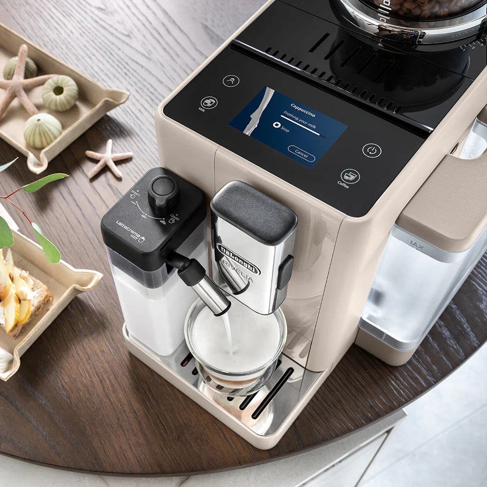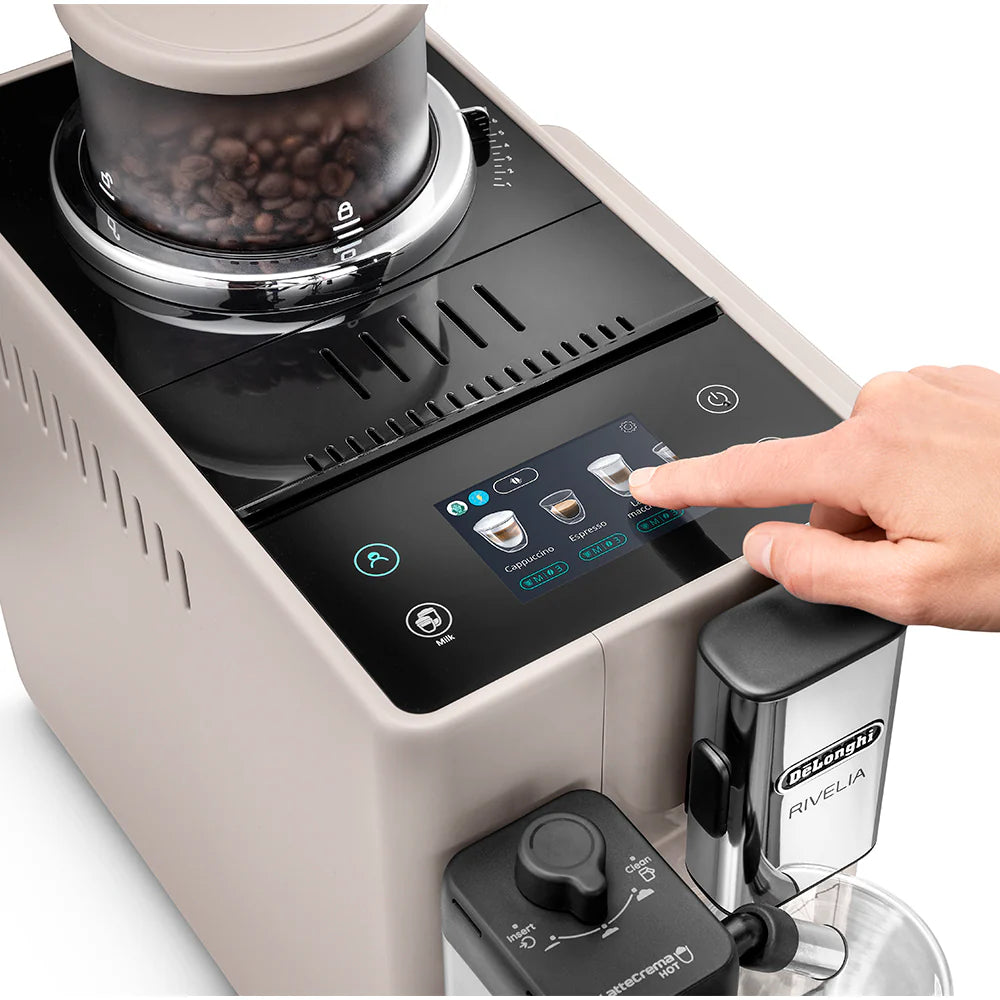 Immerse yourself in the world of coffee with Rivelia. Explore infinite bean varieties with Bean Switch System, enjoy an immersive experience with a 3.5" full-touch colour display, with rich animations and coffee routines tailored to you. Top your milk-based drinks with fine rich foam using LatteCrema Hot Technology, in a compact machine that fits your style, Bean Switch System lets you easily switch and explore different bean varieties,LatteCrema Hot automatically delivers a fine rich hot milk foam, with one touch automatic cleaning.