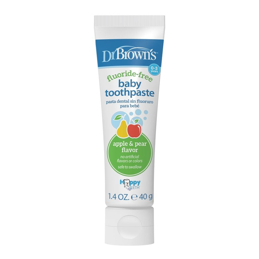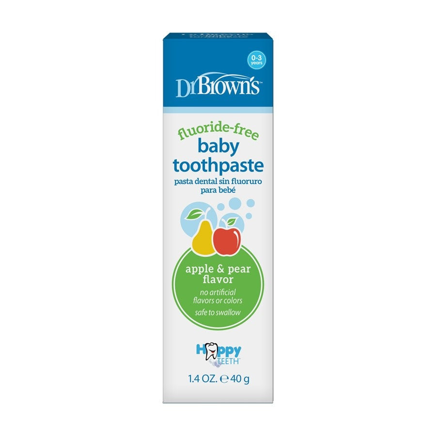 Nothing but clean teeth! Dr. Brown's Natural Baby toothpaste safely and effectively cleans. No fluoride. No artificial flavors, colors, or preservatives. No worries if swallowed. Our natural baby toothpaste is a wholesome way to help your baby learn good dental hygiene. Plus, they'll love the real flavors of Apple and bear! Just add a pea-sized drop to an extra-soft bristled brush and with your help and supervision, teach them to use small circular motions on their teeth and gums, twice a day every day. Never leave your child unattended with toothbrush or toothpaste. . Help baby learn good dental hygiene Safe TO swallow, Fluoride-free Toothpaste Has no Artificial flavors, colors, or preservatives Real Apple and bear flavor babies love Use pea-size drop and brush in small, circular motions on teeth and gums twice a day.