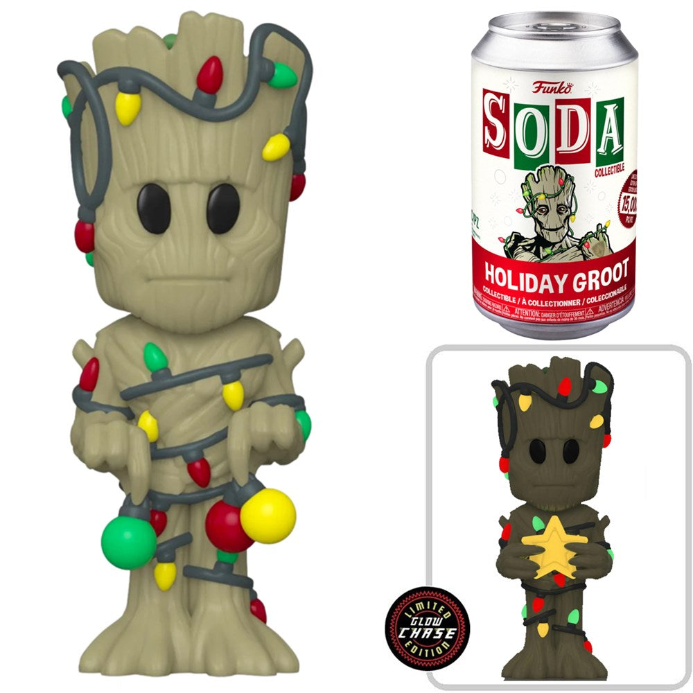 Christmas Groot is depicted in this Vinyl Soda figure with a chase variant, capturing his festive and adorable appearance. The design reflects his holiday spirit and charm, making it a great addition for Marvel fans.