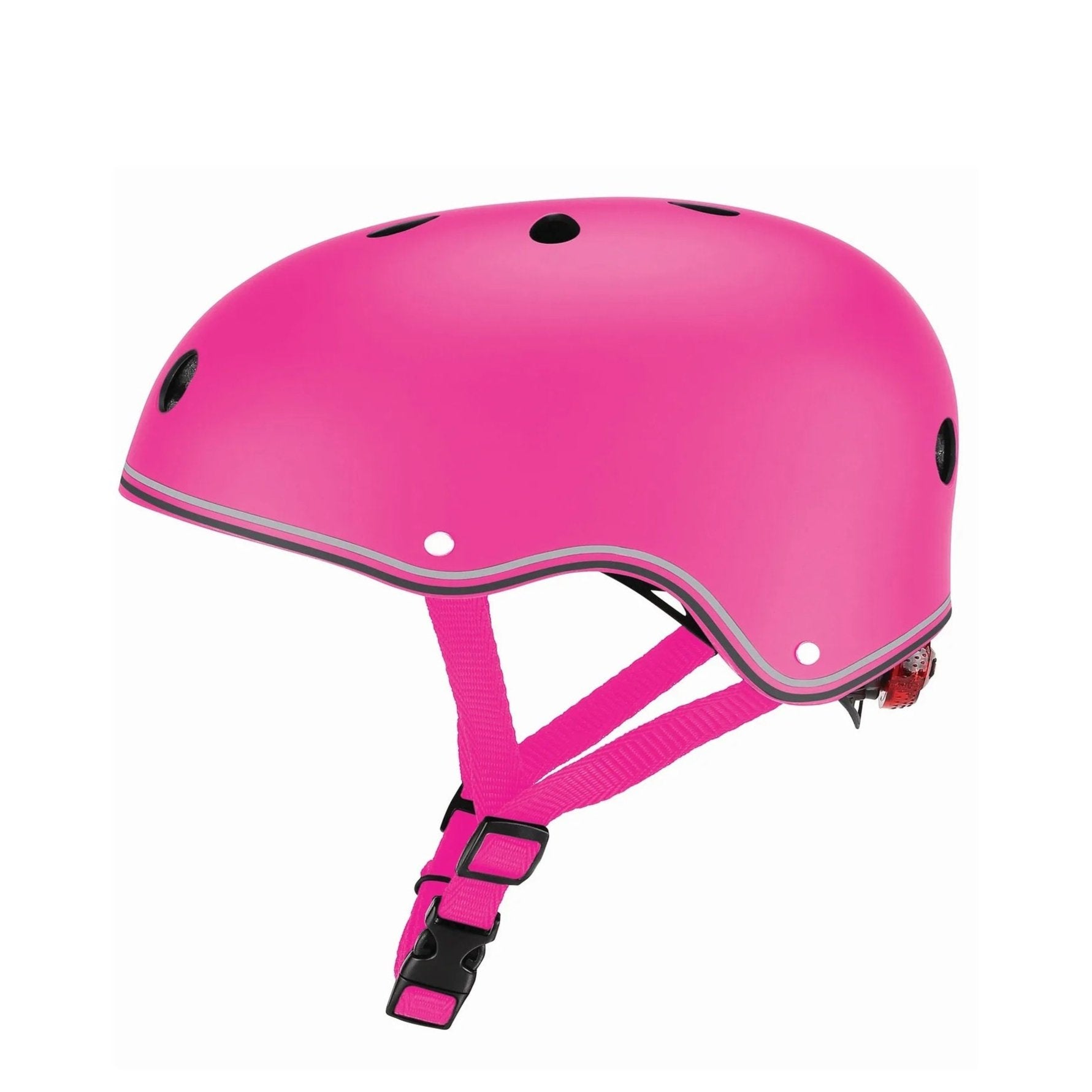 Globber children's helmet size XS/S (48-53 cm) with an adjusting ring, straps for easy and quick fitting of the helmet with a magnetic clasp and a removable visor. The adjusting ring is equipped with LED back lighting to improve visibility in low light conditions. All Globber helmets for children come with foam pads in an ABS housing and provide maximum comfort and safety. 11 air vents around the helmet circumference guarantee the best cooling.