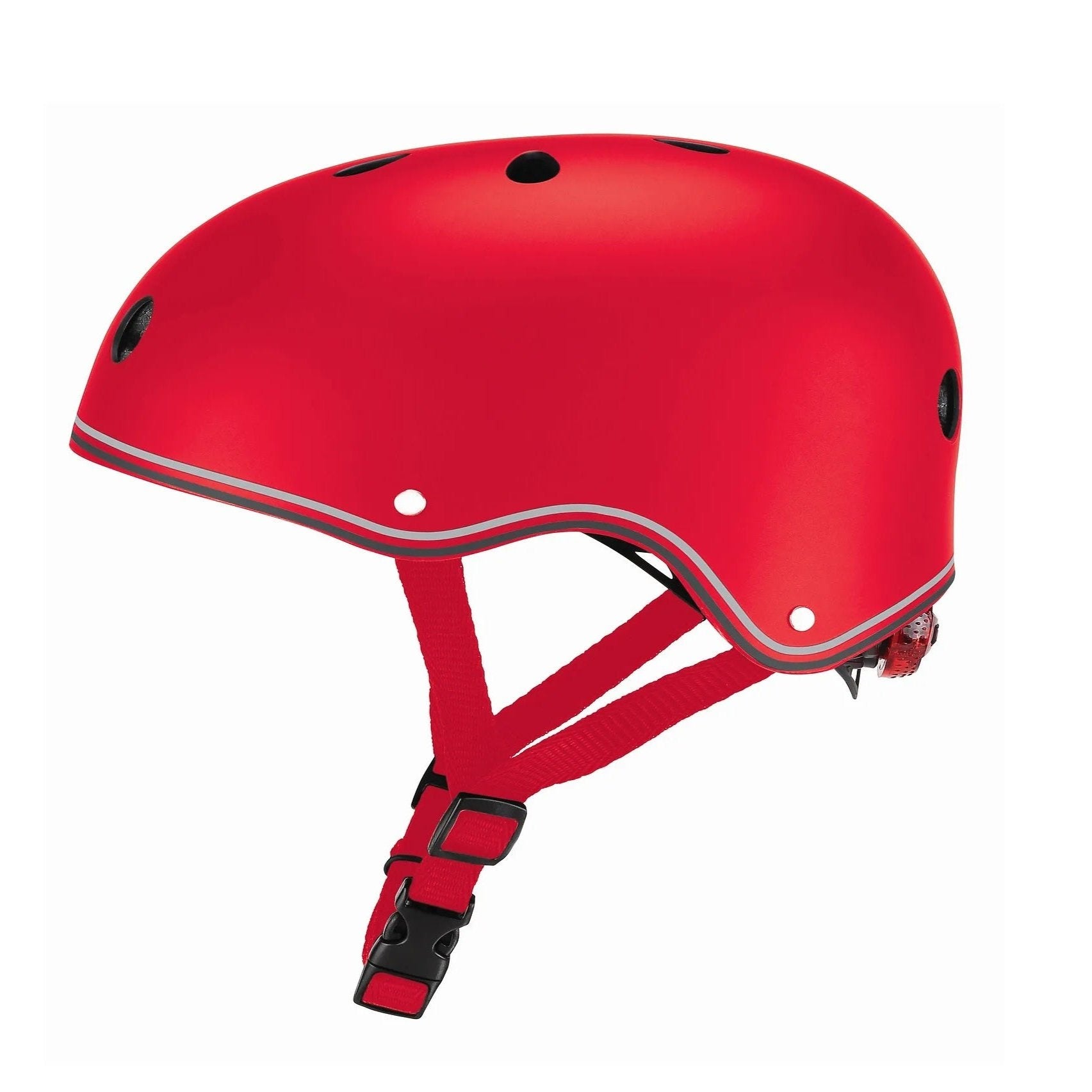 Globber children's helmet size XS/S (48-53 cm) with an adjusting ring, straps for easy and quick fitting of the helmet with a magnetic clasp and a removable visor. The adjusting ring is equipped with LED back lighting to improve visibility in low light conditions. All Globber helmets for children come with foam pads in an ABS housing and provide maximum comfort and safety. 11 air vents around the helmet circumference guarantee the best cooling.