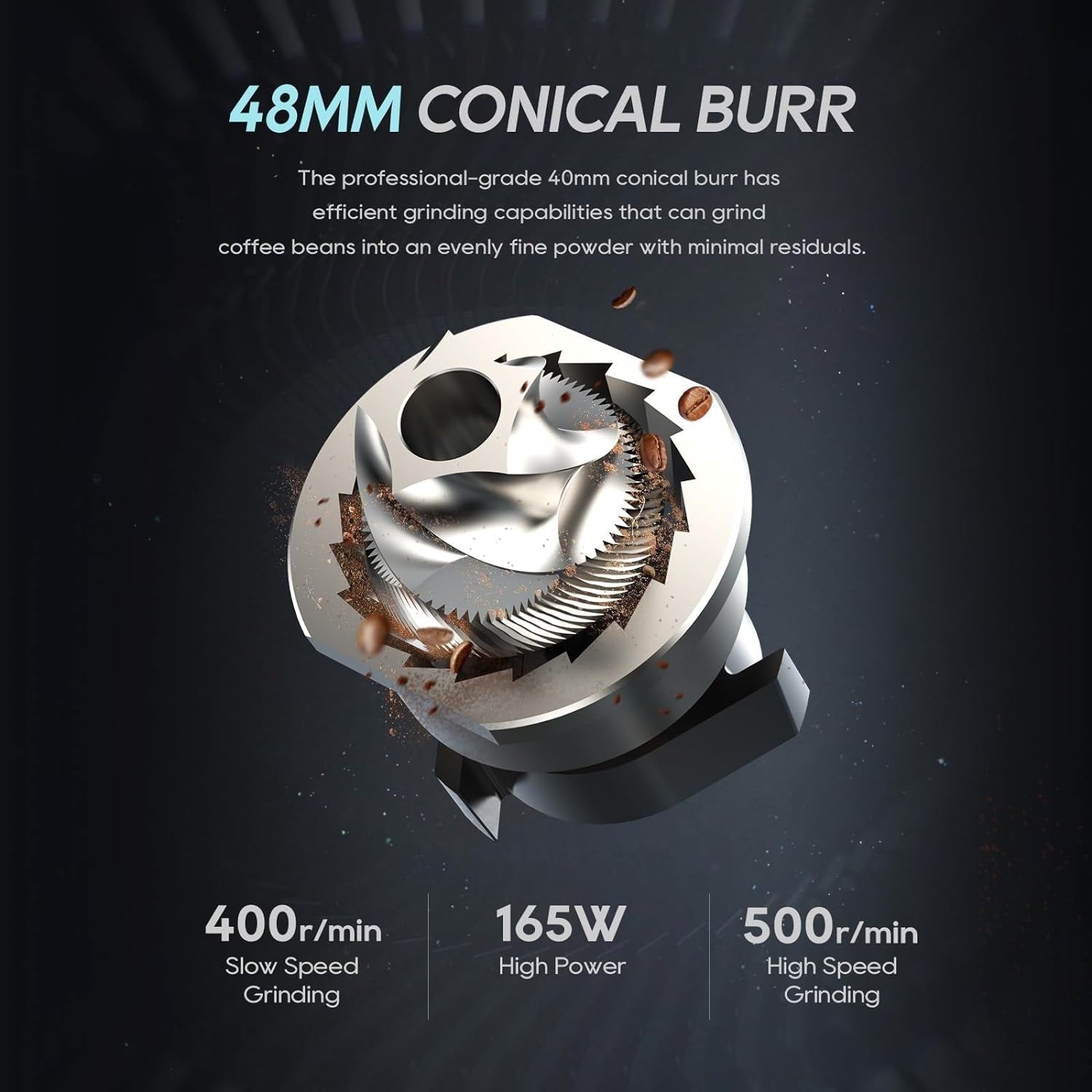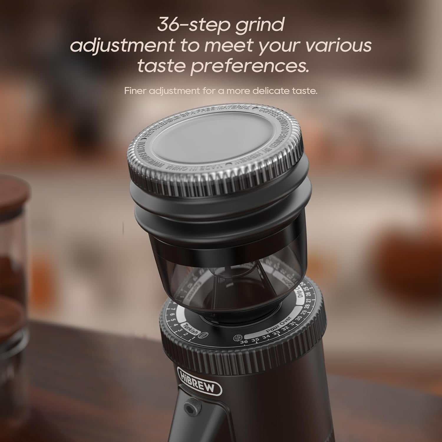 36 Grind Settings: This coffee grinder uses a 48mm conical CNC grinding disk with high hardness, which offers 36 continuously adjustable grind settings that can meet your different needs for espresso/turkey/pour over/mocha/drip coffee.