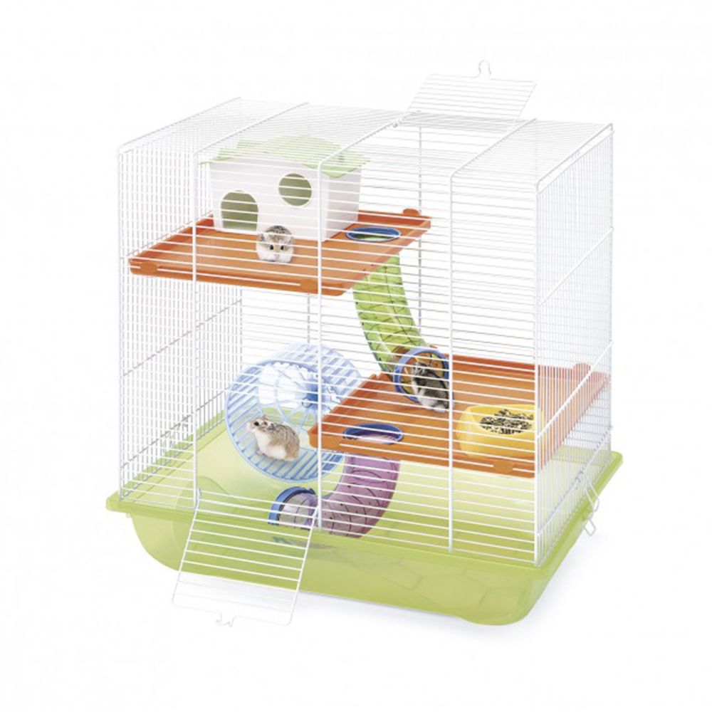 Criceti 7 هو قفص هامستر مع موطن تم تطويره على ثلاثة مستويات متصلة بأنابيب ملونة شفافة. يحتوي على قاع بلاستيكي شبه شفاف قوي وهيكل شبكي معدني مطلي باللون الأبيض. يخلق رفان بلاستيكيان برتقاليان منطقتين منفصلتين حيث يمكن للهامستر النوم والاسترخاء واللعب والأكل. استكمل القفص مما يجعله مريحًا ومضيافًا، يجب أن يستريح حيوانك الأليف Casetta، ومذود Mini Bowl والعجلة المغلقة لا غنى عنها للتمرين اليومي. سهل الصيانة والتنظيف بفضل الخطافات الجانبية التي تسمح لك بفصل الشبكة عن القاع. بابان مريحان بخطافات إغلاق، أحدهما على السطح والآخر على الجانب، يمنعان أي تسرب للقوارض ويسمحان لك أيضًا باستخراجها أو إدخال طعامها دون مشاكل.