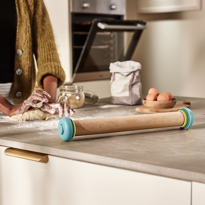 Whatever the required level of thickness, the Joseph Joseph Duo adjustable rolling pin will help you roll out perfectly sized pastry every time. It includes five sets of removable, color-coded rings that allow you to raise the rolling surface to create different pastry thicknesses. Simply twist off the rings you don’t need and you’re ready to roll.