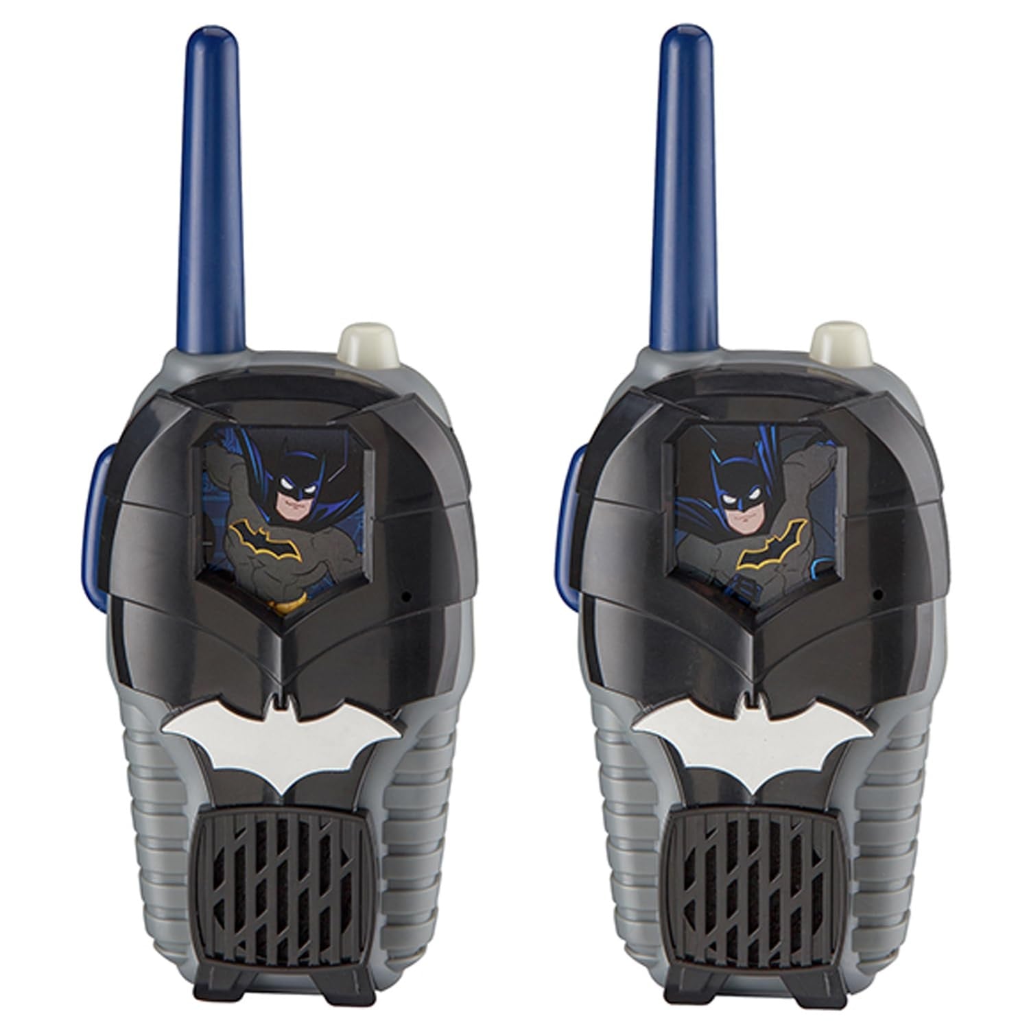 The new DC Batman FRS walkie talkies are here! Spend amazing time, pretend you and your friend are here to save the day with the push to talk button that makes these walkie talkies fun and easy to use. Send your voice messages over Static-free and extendand range radio signal and receive back over clear speaker. The awesome character graphics makes this perfect for anyone. These walkie talkies can communicate up to 500 ft of range under ideal condition. This is a perfect gift or birthday present for your little ones.