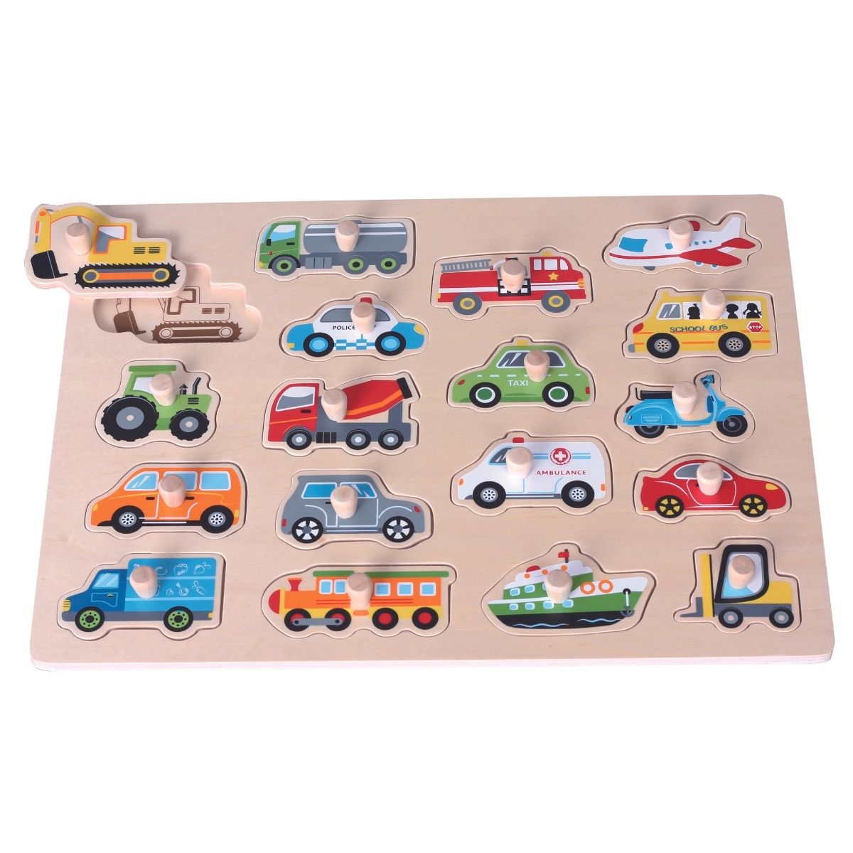 Multiple transport vehicles: The puzzle comes with several wooden pieces, each representing a different type of transport vehicle, such as a car, airplane, or truck.