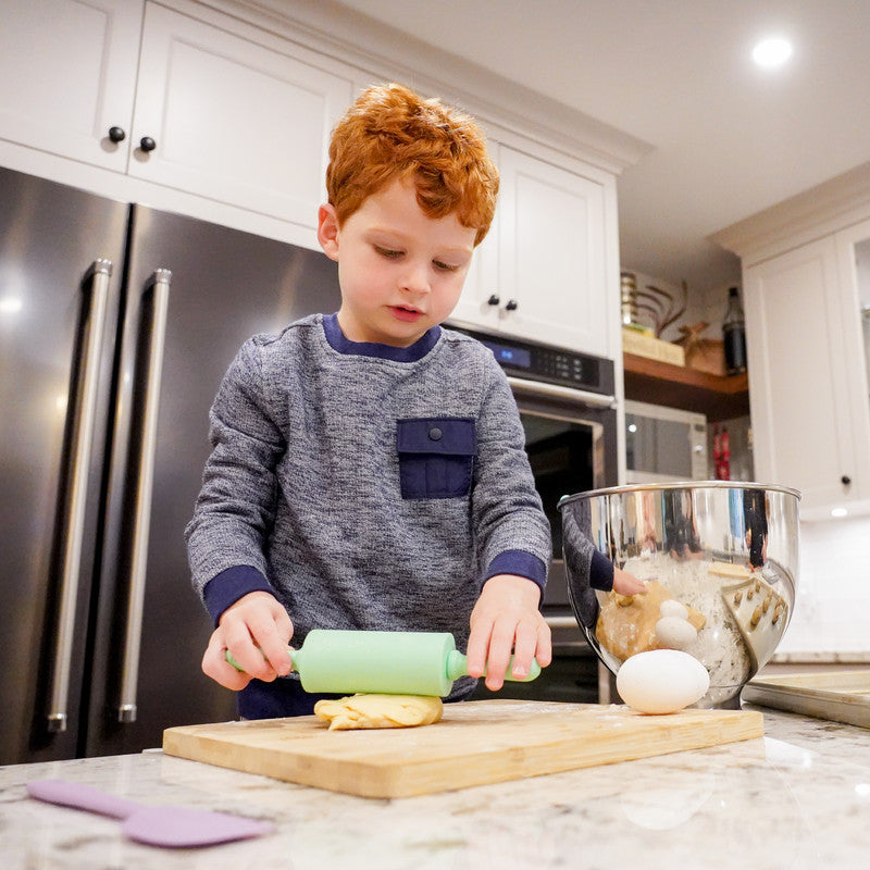 Encourage kids to become mini chefs with our 5 Piece Mini Baking Tool Set. This set is perfect for kids who love to cook and parents brave enough to cook with their kids! Once you look past the imminent mess, you and your children will have a blast cooking and baking scrumptious food side by side. The tools are sized for little hands and includes a mini rolling pin, silicone whisk, silicone turner, silicone spatula and silicone basting brush. Made of soft food grade silicone and durable stainless-steel core, which is surely a requirement for young chefs learning to properly use their tools. And if your little one isn’t quite ready to cook with real food, the set is a ton of fun in a play kitchen! Perfect for babies, toddlers and kids. This set even makes a great gift! Easy to clean and top rack dishwasher safe (except rolling pin). Free of harmful chemicals: BPA free, lead free, cadmium free, PVC free.