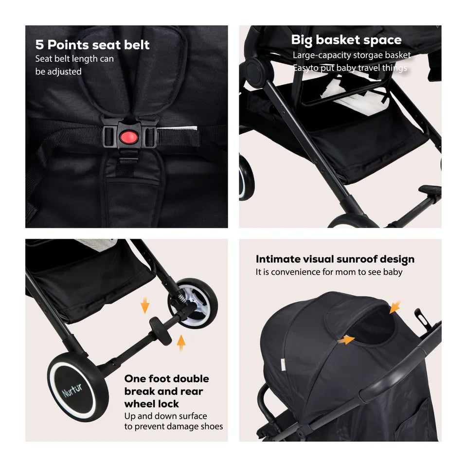 Traveling with a baby is hard, Especially when you don’t have the right gear and finding the right stroller can be overwhelming. With so many different options, It's hard to know what you need and which features are really important. There are a lot of choices out there, but not all of them make sense for your lifestyle or budget. If you want something that’s easy to use every day, this is your best bet! The Nurtur bravo travel stroller is perfect for parents on-the-go who travel a lot and want something to have all-in one solution to their travel problems. the seat reclines fully flat with the adjustable reclining belt. this stroller folds up and unfolds quickly and includes a large durable storage cabin! when its time to travel, quickly fold it and you can store it in the airplane cabin due to its compact designs – no assembly required! if you want a smooth travel stroller, keep your child safe and light enough to carry through a busy queues in the airport terminal, then this nurtur bravo travel stroller is perfect for you!.