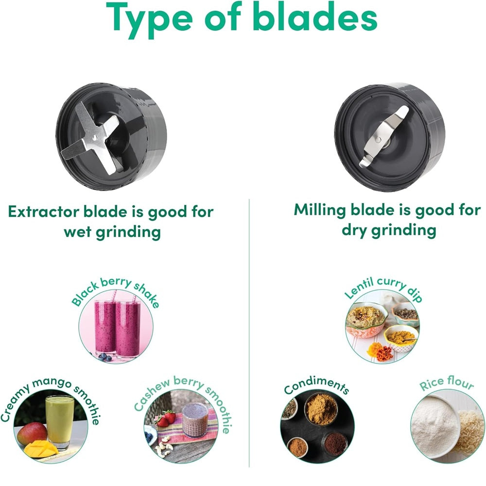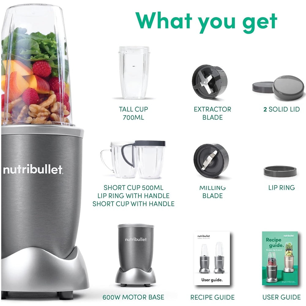 What you get:, (1) extractor blade, (1) milling blade, (1) 700ml cup, (1) 500ml cup, (1) 500ml cup with handle, (1) lip ring, (1) lip ring with handle, (2) solid lid, 600 watt motor base + user guide also included + recipe book. Also included
