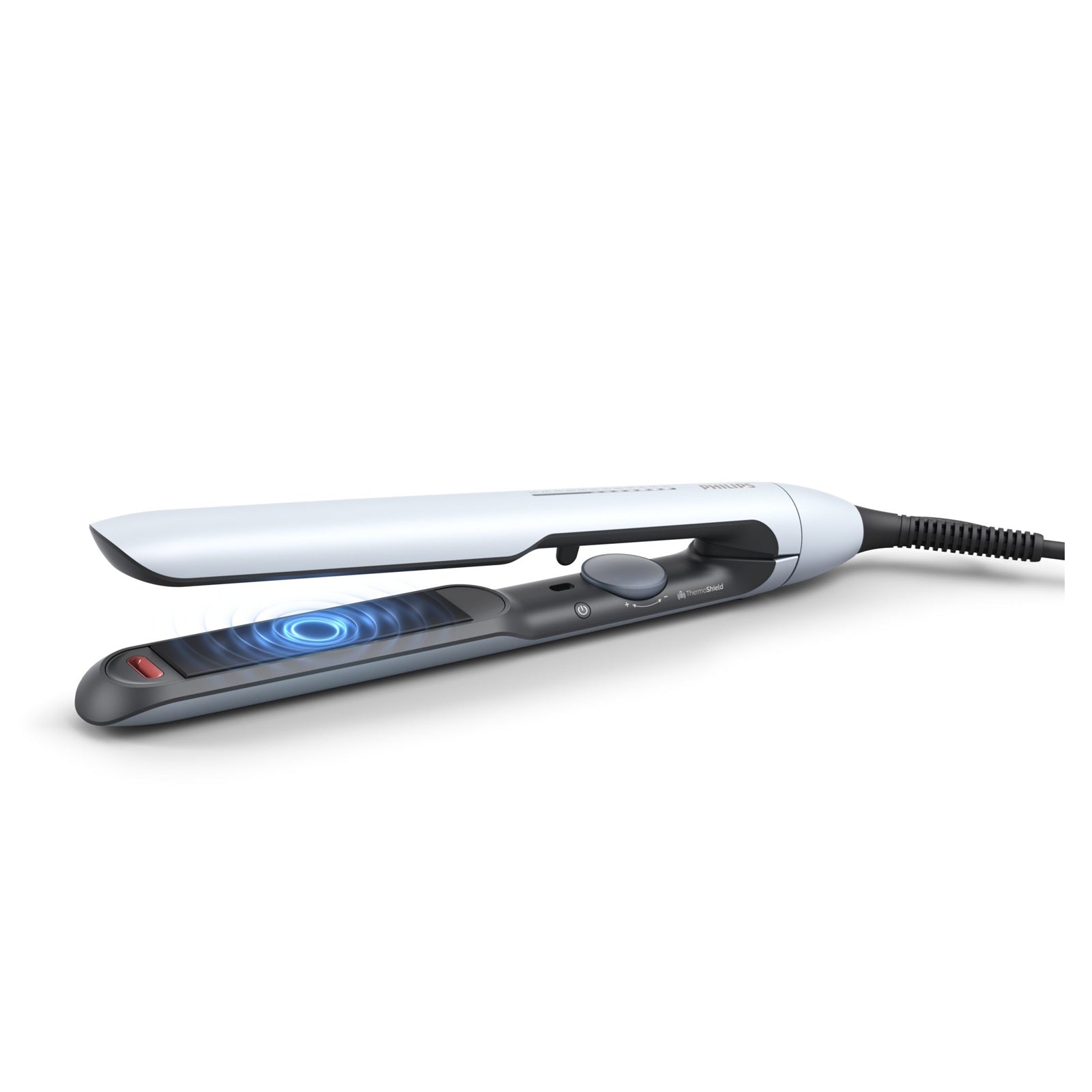 ThermoShield technology lets you style with less heat damage. Its' sensor regulates the temperature so that from root to end, your hair gets the ultimate even styling it deserves. Smooth plates help the straightener glide smoothly through the hair, so you can spend less time styling and more time enjoying the same great result. This powerful ionic system intensifies your hair's shine with 2x the ionic care per styling session. Charging you hair with millions of negative ions per cubic centimeter eliminates static, conditions your hair and smoothens its cuticles. So you can enjoy frizz-free hair with vibrant shine.