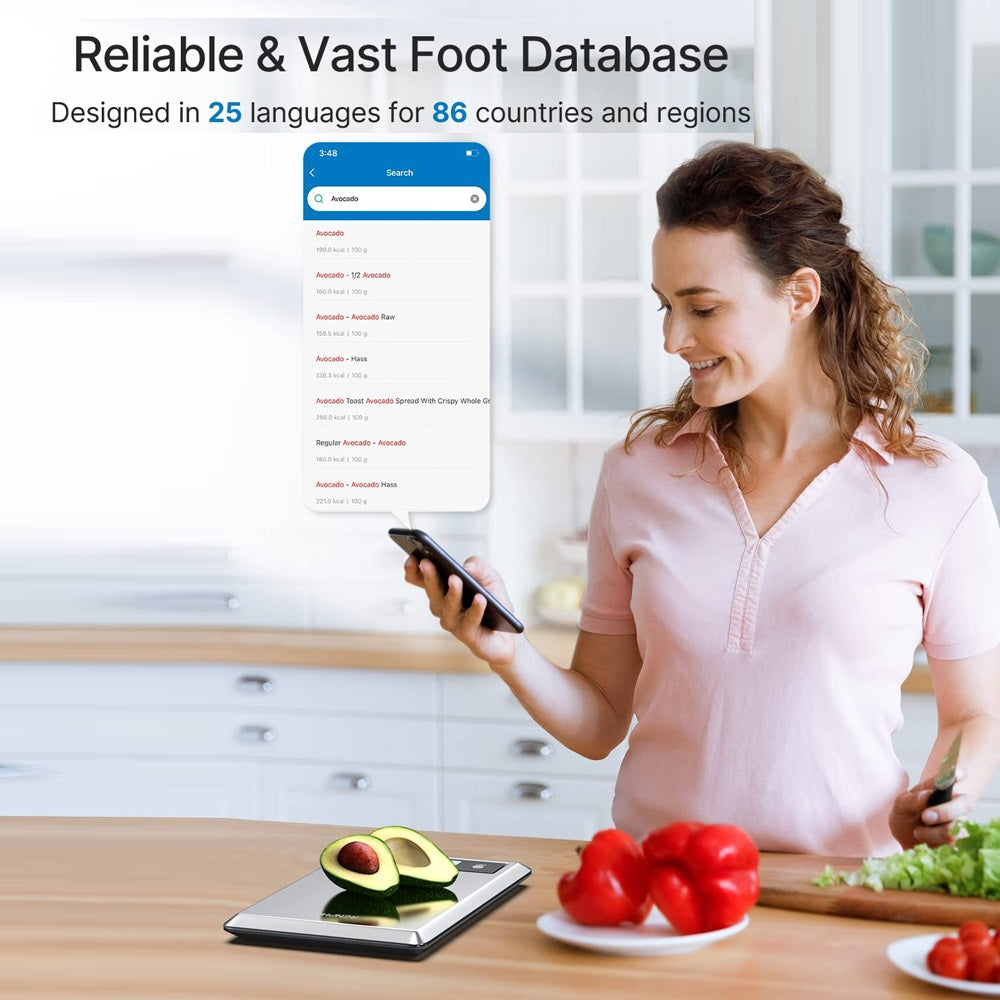 يعمل مع تطبيق متعدد الوظائف: يمكنك تشغيل مقياس الطعام بسهولة من خلال تطبيق "Gennec" / "Renpho Health" لمراقبة المدخول الغذائي وحساب السعرات الحرارية وتخزين مذكرات التغذية. يوفر التطبيق إمكانية الوصول إلى عشرات الآلاف من الأطعمة مع حقائق التغذية، بما في ذلك السعرات الحرارية والفيتامينات والبروتينات، ويمكنك أيضًا إضافة بيانات طعامك وتخصيصها حسب الحاجة.