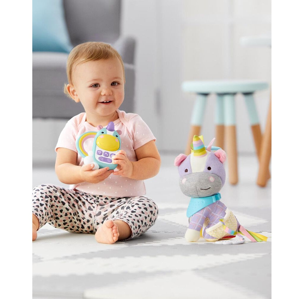 تحدث عن السحر! هذا الهاتف الجذاب على شكل وحيد القرن يبقي الطفل مشغولاً وسعيدًا بأصواته الجميلة وأغانيه والمزيد. من القرن المضيء إلى مقبض سكاي سهل الإمساك والأزرار الملونة، سيحب طفلك الصغير استكشاف هذا الصديق الخيالي.