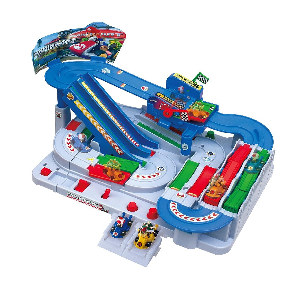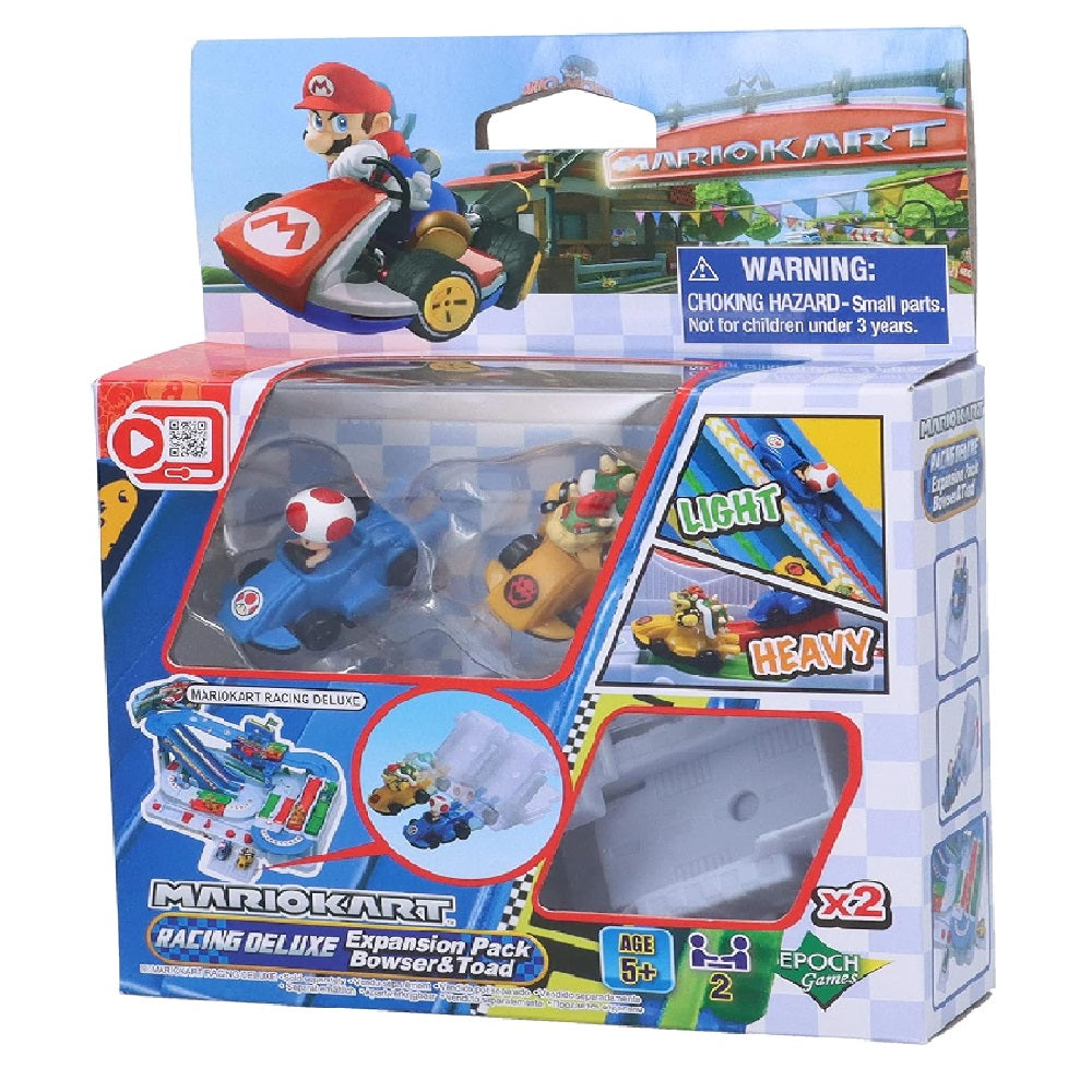 Inspired by the world of Mario Kart, iconic Mario Kart characters, Bowser and Toad are here to join Epoch Games' Mario Kart Racing Deluxe tabletop action racing game! Just like the video game, the karts come in varying weights! Master racing with all weight classes! They're not just simple expansion karts - have fun playing with the karts as vehicle toys as well! Each kart comes with garage shaped sliders, allowing independent play. Detailed kart figures are fun to collect and display as well! This product is for 1~2 players and is suitable for ages five years and up.