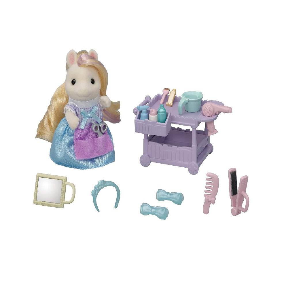 • The Pony's Hair Stylist Set features a cart, hair accessories, and Manely Pony mother Serafina, the silky-haired hairdresser.