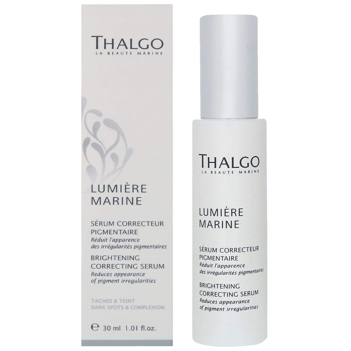 Thalgo's Lumière Marine Brightening Correcting Serum targets the main causes of discoloration including UV exposure, aging, blue light, and pollution. Rich in Brown Algae Extract and brightening agents, this serum acts simultaneously on dark spots and on skin irregularities. After 7 days, the skin is smoother and the complexion more luminous. After 28 days, dark spots seem less visible, and the complexion looks brighter and more even.