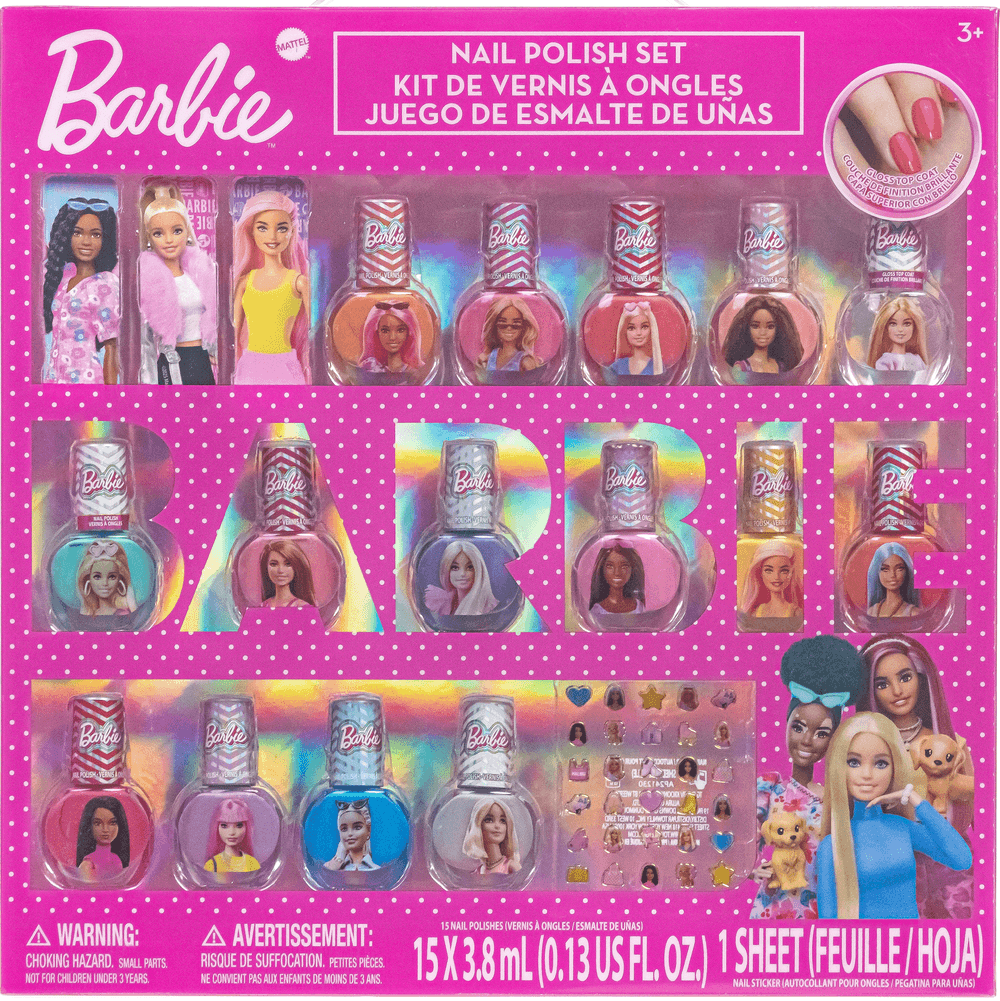 Set Includes: This set includes 15 water-based, peelable, bubble gum scented nail polishes in different shades of pink, teal, purple, red, gold and more, three nail files, and 1 sheet of nail stickers, all decorated with Barbie, her gal-pals, and that extra flair.