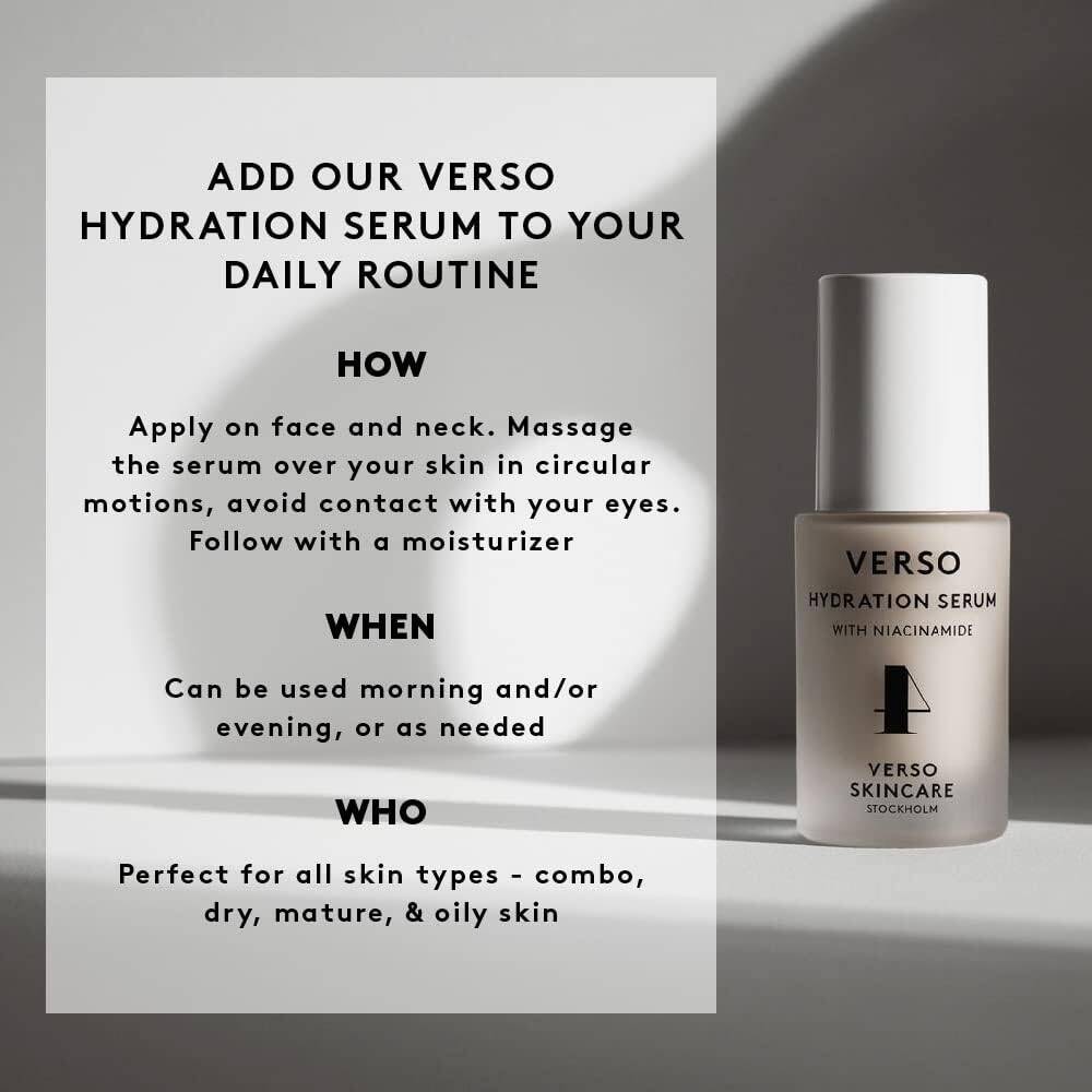 تركيبة فريدة من نوعها من الدهون والزيوت الشوفانية، المشتقة من بلدان الشمال الأوروبي، تقلل من خطر ظهور تهيج الجلد الناجم عن نقص الرطوبة. سيترك النياسيناميد البشرة بمظهر أكثر نعومة وسلاسة يدوم طويلاً مع زيادة مقاومة التأثيرات المرئية للعوامل البيئية المسببة للإجهاد. يحتوي مصل الترطيب Verso على الأفينانثراميدات والسيراميدات وبيتا جلوكان وفيتامين E والأحماض الدهنية؛ مضادات الأكسدة ذات الخصائص المهدئة وربط الماء.