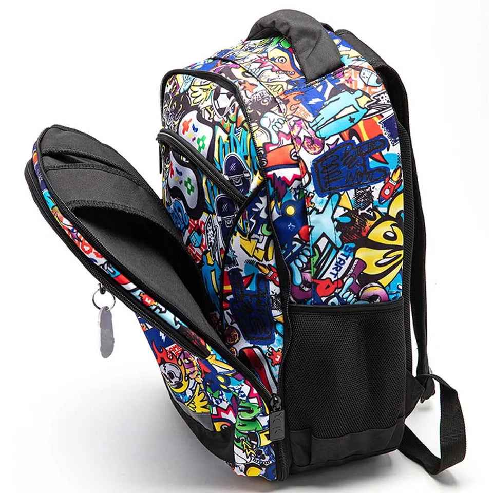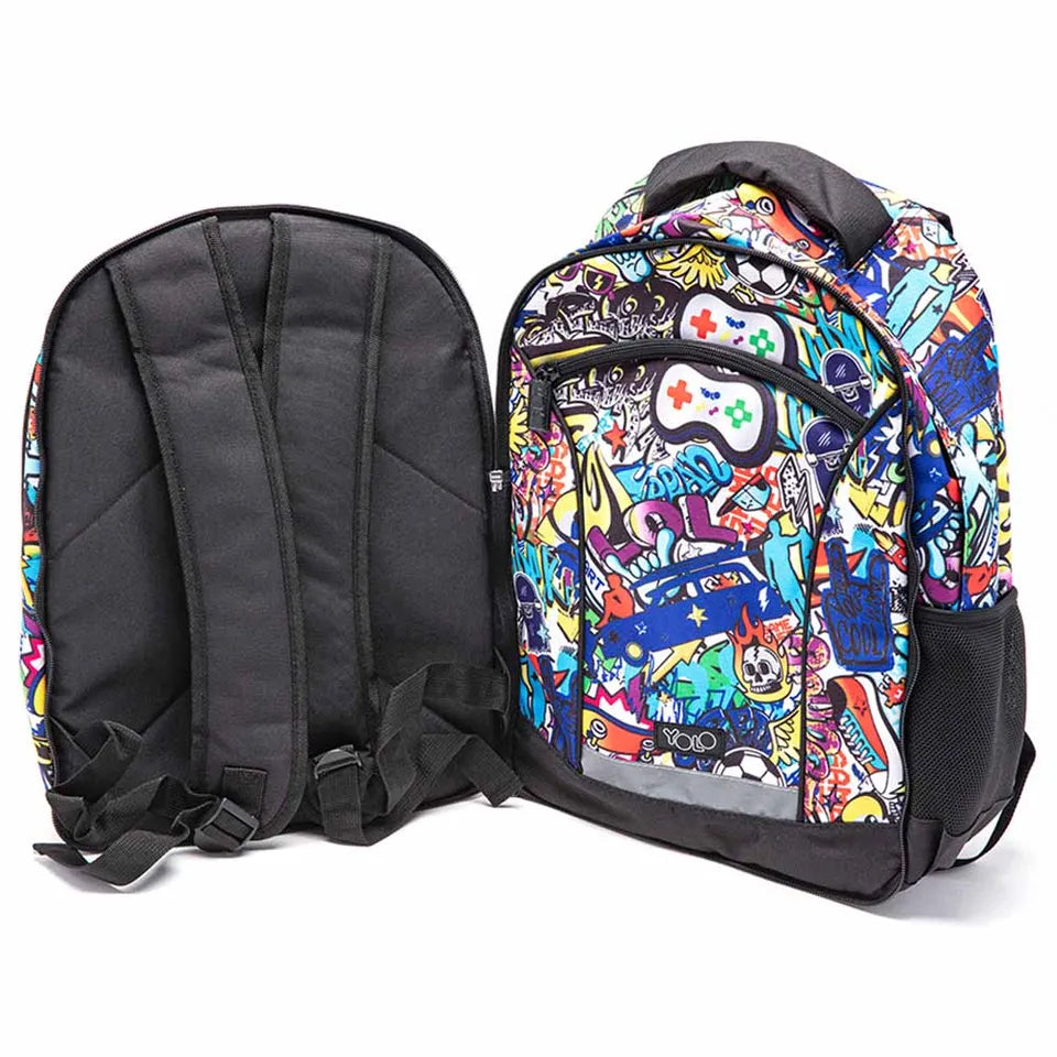 Introducing YOLO's Perfect 2 in 1 School Bag - the ultimate solution for students who crave versatility, comfort, and style! Our innovative 2-in-1 bag is designed to adapt to your needs, offering the flexibility to separate into two distinct bags for lighter or heavier days. Crafted from durable and waterproof fabric, our school bag ensures that your belongings stay safe and dry, regardless of the weather conditions. Say goodbye to worries about unexpected rain showers or accidental spills, as our bag's water-resistant feature provides peace of mind throughout the day. , , Comfort is key when it comes to carrying heavy loads, and we've got you covered. Our bag features a padded and ventilated back system that not only offers exceptional support but also wicks away sweat, keeping you cool and comfortable during those long school days. Say goodbye to uncomfortable, sweaty backs and hello to ultimate comfort and breathability. Organization is made easy with our thoughtfully designed compartments. The bag boasts three spacious compartments, allowing you to neatly organize your books, notebooks, and other essentials. , , Plus, with a separate padded area specifically designed to safeguard your laptop, you can transport your technology with peace of mind. Additionally, our bag features a convenient front pocket, providing quick and easy access to smaller items like pens, pencils, and your mobile phone. Need a spot for your water bottle? We've got you covered with two side pockets designed to hold your hydration companion, keeping you hydrated and refreshed throughout the day. With a generous volume of 28 liters and dimensions of 50*35*20cm, our bag offers ample space for all your school essentials and more. No need to worry about cramming everything in or leaving important items behind. We've got you covered with the perfect balance of storage capacity and compact design. , , Durability and functionality go hand in hand with our high-quality zippers, ensuring smooth and hassle-free operation every time. Rest assured that your belongings will stay secure and protected throughout your daily adventures. Last but not least, our Perfect School Bag features a cool and trendy graffiti design that adds a touch of personal style to your everyday look. Stand out from the crowd with our eye-catching design that is sure to make a statement among your peers. Experience the ultimate combination of functionality, comfort, and style with YOLO's Perfect 2 in 1 School Bag. Don't miss out on this must-have accessory for the modern student. Grab yours today and embrace a hassle-free and stylish school experience like never before!