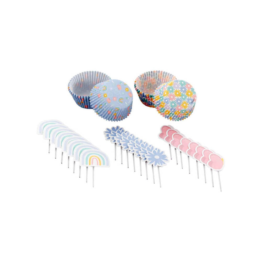 - 24 قطعة من زينة الكب كيك، 3 تصاميم: قوس قزح، أزهار الأقحوان الزرقاء، فراشات وردية (8 من كل تصميم)