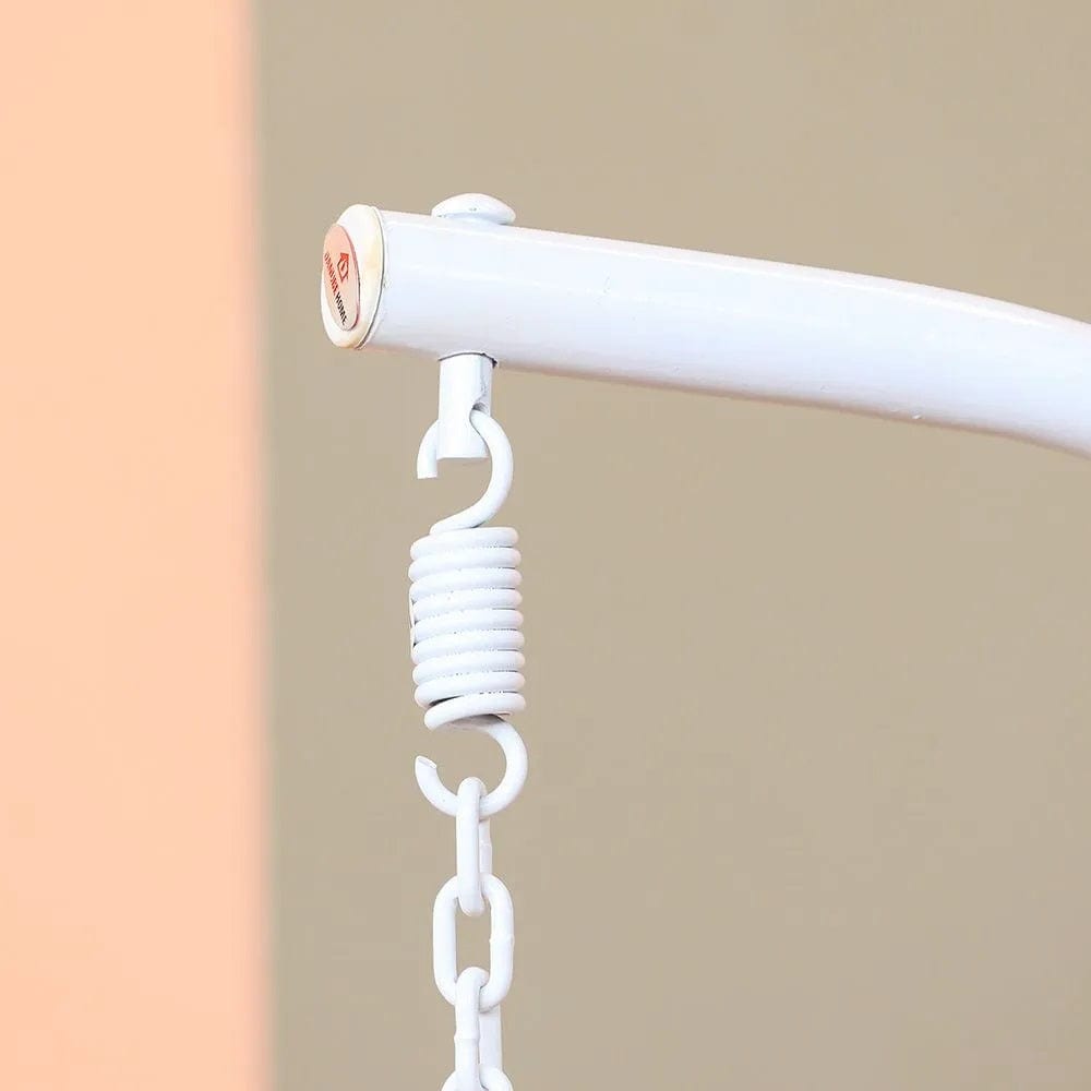 Chic Design: Crafted with white rattan and a white powder-coated frame, this hanging chair seamlessly merges contemporary aesthetics with durable construction.
