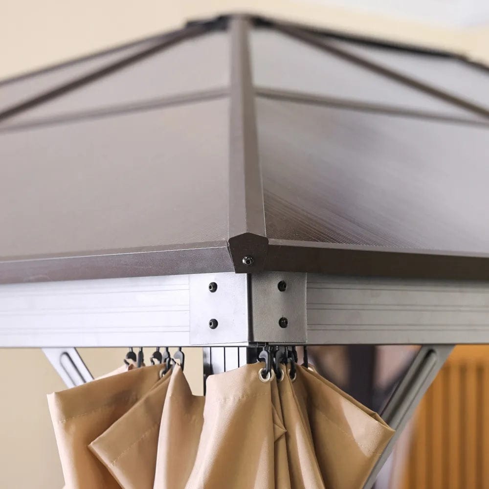 - It is famous for its polycarbonate sheet! This gazebo comes with quality heat insulation as it absorbs heat to keep you cool. The high thick fiber hooks hold the curtains which ensures that the material does not tear apart. Made with a strong steel-based structure.