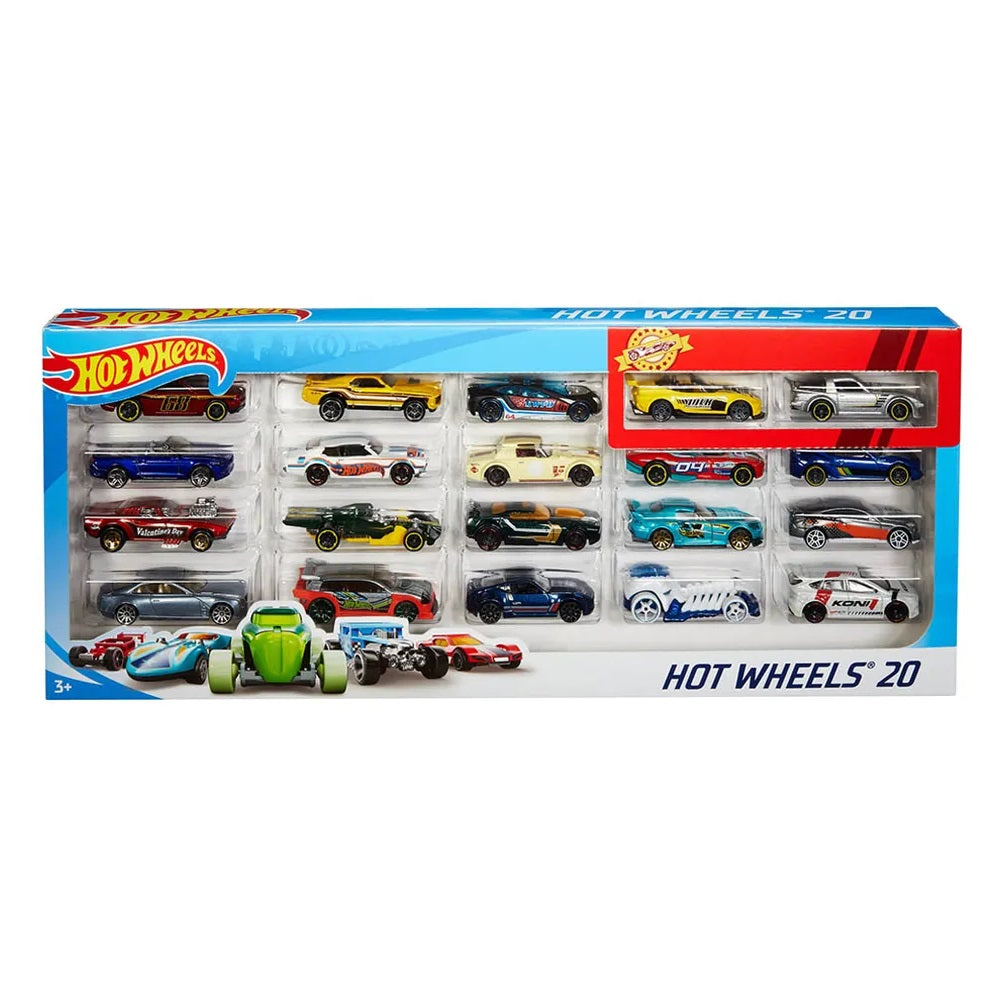 The Hot Wheels 20-Car Pack delivers a multipack of 1:64 scale vehicles in an open-window package that displays the entire set! Collectors, car enthusiasts and kids will love the collection of modern and vintage models and hot designs for push-around play, track-set action and to put on display. Included in each set are two exclusive vehicles for the ultimate in collectability. Colours and decorations may vary.