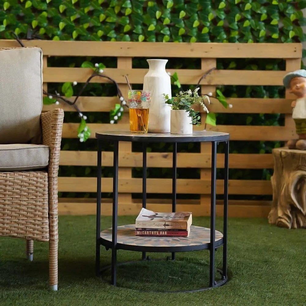 طاولة القهوة المعدنية ذات الطبقتين هذه مناسبة لشرفتك وحديقتك وفناء منزلك، وتوفر لك خيارات تخزين وعرض واسعة. يمكن استخدام الجزء العلوي من هذه الطاولة لعرض المقتنيات الثمينة أو إطارات الصور أو حتى المزهريات. تتيح لك مساحة أكبر لوضع كتاب أو كوب من القهوة أو الزهور. تصميم بلاط الفسيفساء متعدد الألوان على سطح الطاولة يجعلها مميزة. ستكون الطاولة إضافة جمالية مثالية لمساحتك.