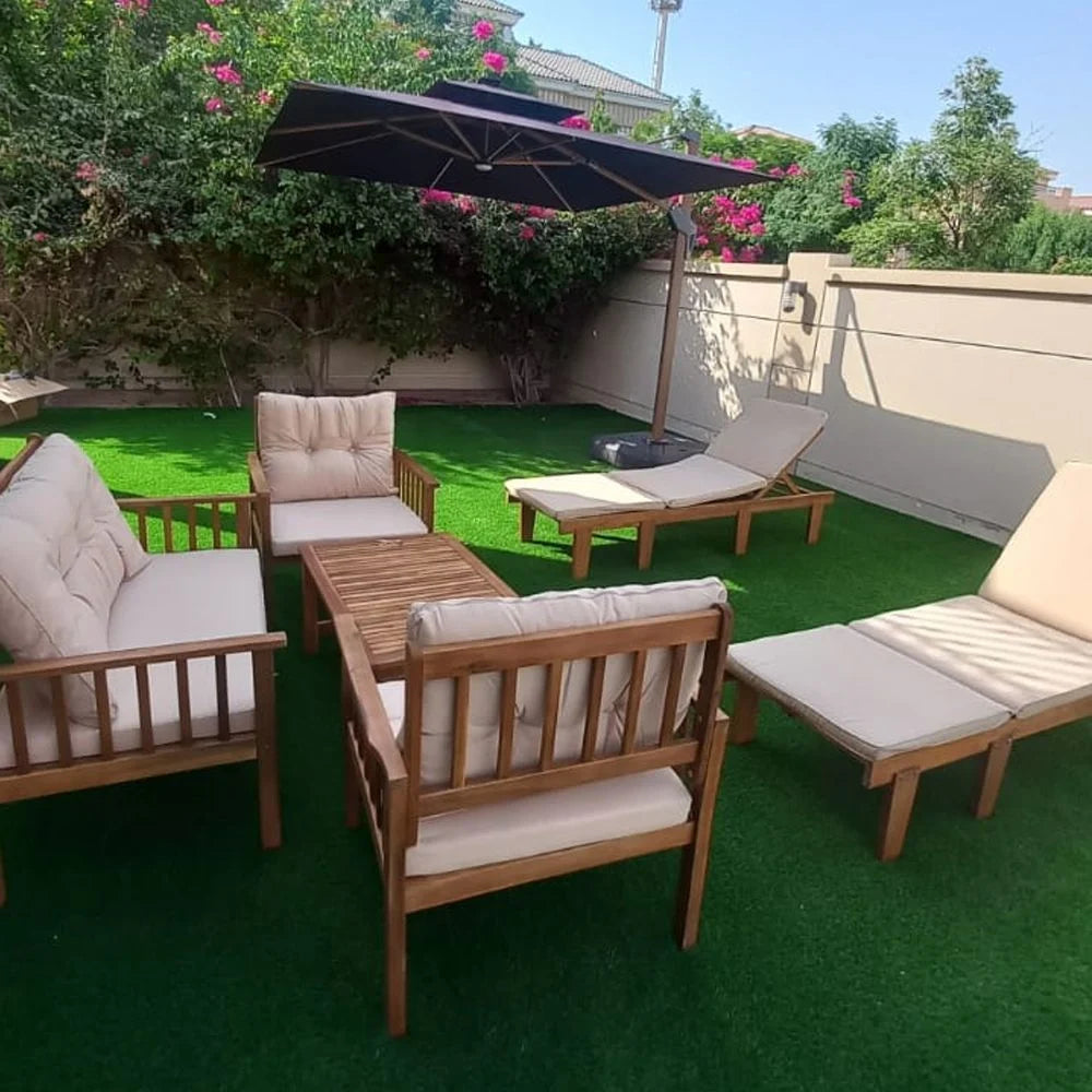 - تم تصميمه ليتحمل عوامل الطقس باستخدام خشب مقاوم للطقس وقماش متين