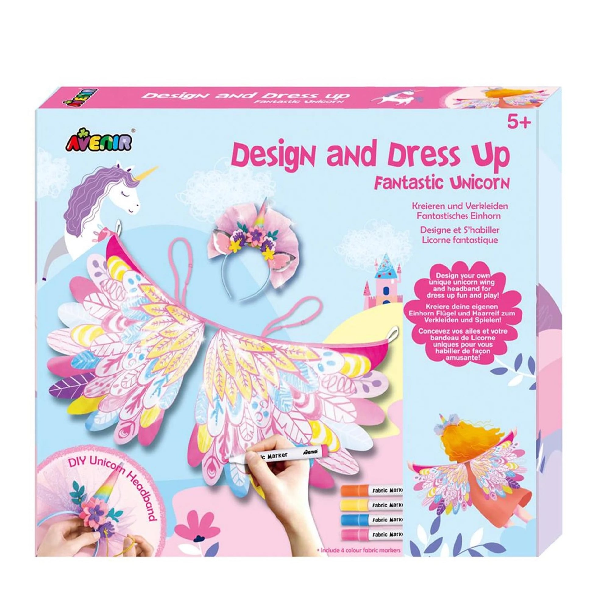 A great easy way for a little artist to create their own themed costume for dress up fun!The Unicorn Set includes a pre-printed set of wings which can be further decorated with the enclosed markersAlso includes a pre-punched felt, a safe plastic needle and a charming headband to decorateEncourage your child to get creative and develop their craft skills to produce a unicorn dress up head band and wingsSuitable for all unicorn enthusiasts.