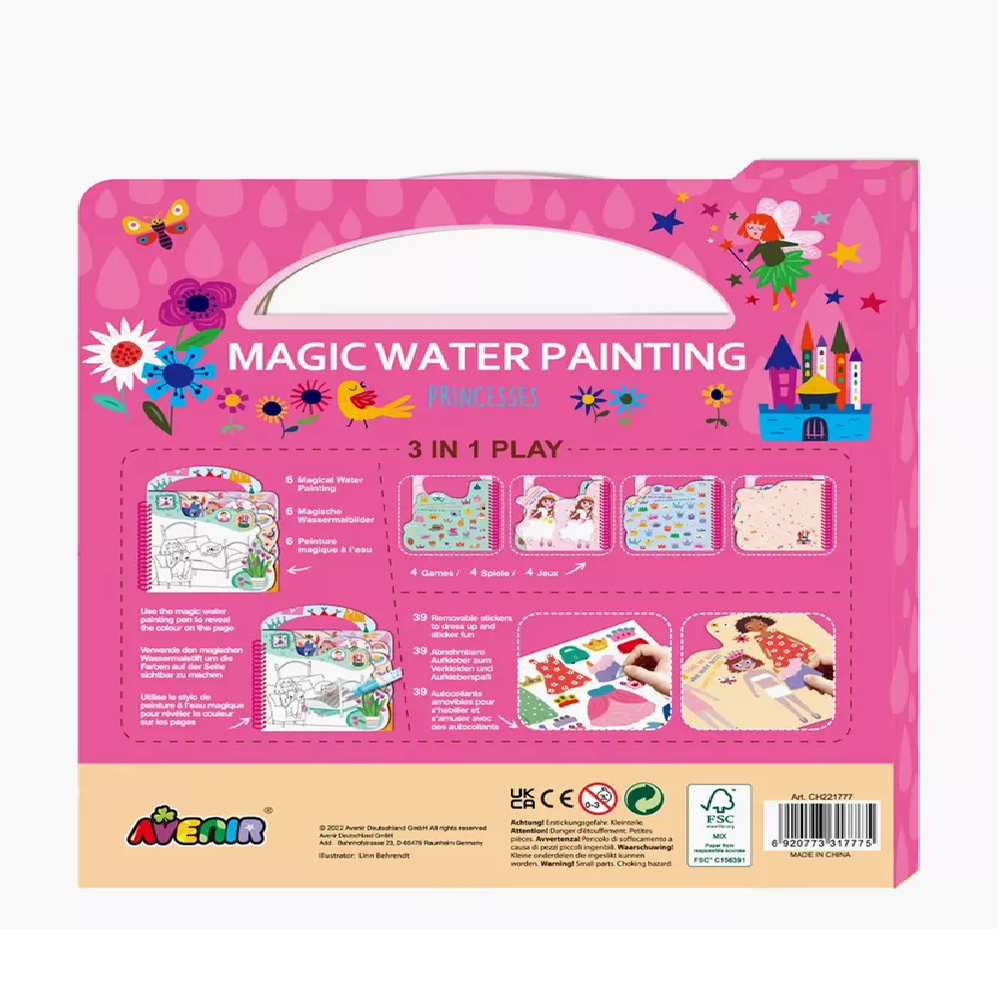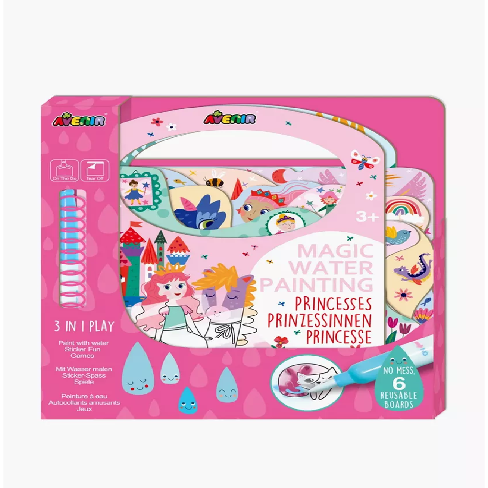 كتاب تلوين Avenir Magic Water Painting - Princesses هو كتاب تلوين في عبوة عملية بمقابض، حتى تتمكن من حمله بسهولة! سيبقى أطفالك مشغولين طوال اليوم! يمكنهم رسم الصور مرارًا وتكرارًا، فقط عن طريق ترطيب الفرشاة بقليل من الماء. بمجرد أن تجف الورقة، يختفي اللون من أجل متعة متكررة! مع الألغاز الإضافية المخفية داخل الكتاب، نعدك بأنك لن تشعر بالملل أبدًا! يتضمن كل كتاب 6 أسطح تلوين قابلة لإعادة الاستخدام وورقتين من الملصقات القابلة لإعادة الوضع للأنشطة ذات الطابع الخاص وقلم ماء قابل لإعادة التعبئة. املأ قلم الماء بماء الصنبور العادي، ثم ارسم للكشف عن اللون على الصفحات - سيختفي عندما يجف الماء، ثم يمكنك البدء من جديد، تمامًا مثل السحر! لمضاعفة المتعة، أضفنا الكثير من الأنشطة لإلهام التعلم والاستكشاف والخيال لدى الأطفال! تصميمات سهلة الحمل في أي مكان - رسوم توضيحية وأسلوب رائع - الرسم بالماء يعني عدم الفوضى - العب بملصقات إعادة الوضع وتعلم - لعبة المتاهة - ابحث واعثر