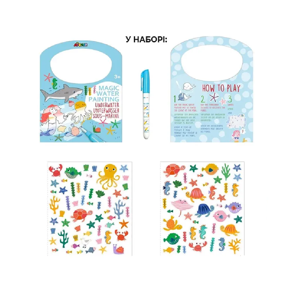 Avenir Magic Water Painting - Underwater, is a coloring book in a practical package with handles, so you can carry it easily! Your little ones will stay busy all day! They can paint the pictures again and again, just by wetting the brush with a little water. Once the sheet dries, the color disappears for repeat fun! With the extra puzzles hidden inside the book, we promise you will never get bored! , , Each book includes 6 reusable colouring surfaces and two sheets of repositionable stickers of themed activities and a refillable water pen. Fill the water pen with regular tap water, then draw to reveal the colour on the pages - it'll disappear when the water dries, then you can start again, just like magic! To double the fun, we've added lots activities to further inspire kids' learning, exploration, and imagination! Easy take anywhere designs - Fabulous illustrations and styling - Painting with water means NO MESS - Play with reposition stickers and learn - Maze game - Seek and find.