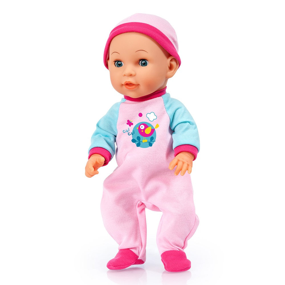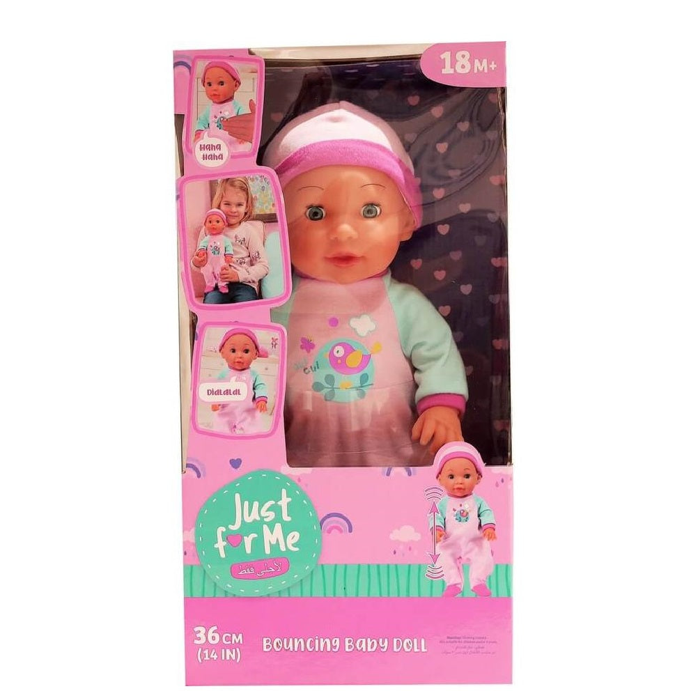 Bouncy Baby هي دمية طفل يبلغ طولها 36 سم ولديها 18 وظيفة. تتحرك لأعلى ولأسفل وتصدر أصواتًا مضحكة. ترتدي رومبر ورديًا جميلًا مع قبعة متناسقة. التوصيل يشمل البطاريات في صندوق عرض جميل.