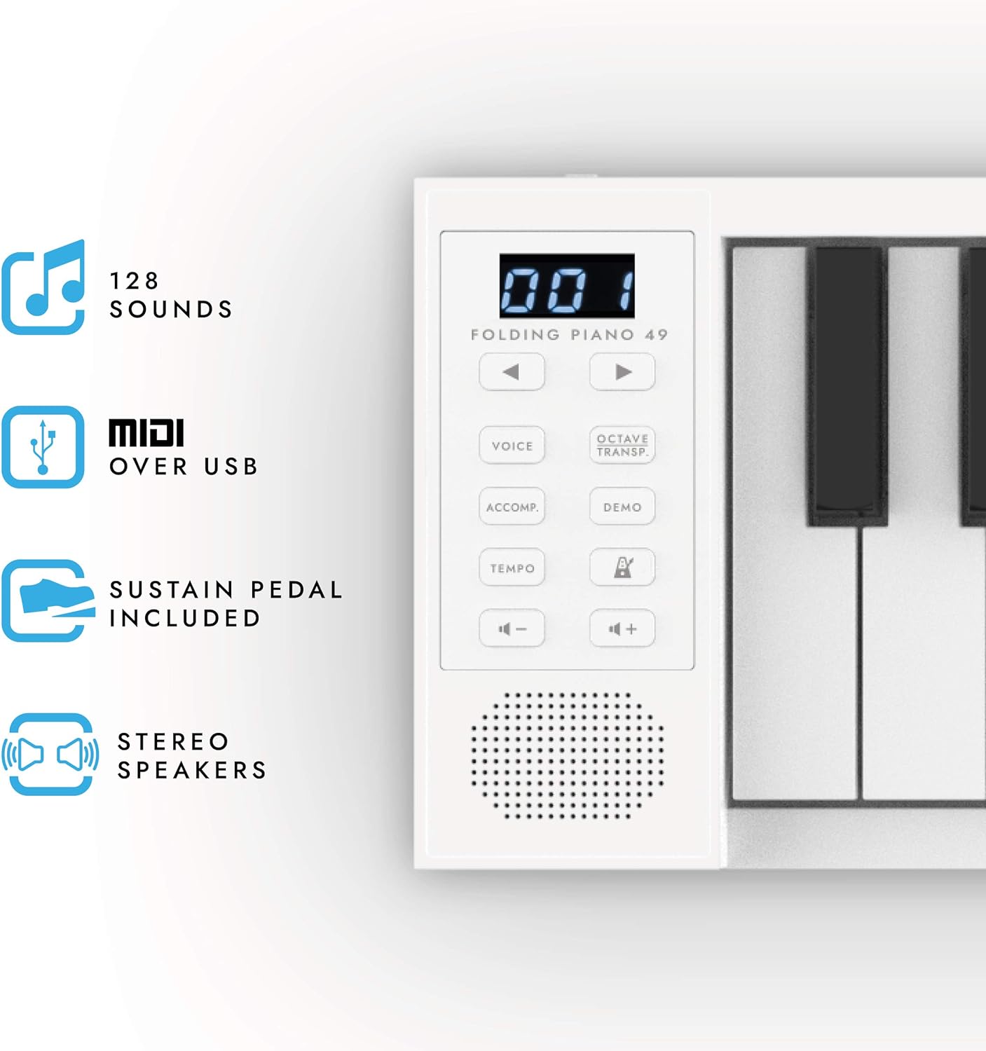 على الرغم من حجمها الصغير، فإن لوحة المفاتيح Carry-On 49-Key تقدم 49 مفتاحًا بالحجم الكامل مع حساسية لمس قابلة للتعديل، مما يسمح بالتعبير والديناميكية. توفر لوحة المفاتيح خفيفة الوزن والمتينة إحساسًا طبيعيًا بالبيانو لممارسة التقنية والأداء، بينما يسمح نظام المفصل الحاصل على براءة اختراع في لوحة المفاتيح القابلة للطي بطي المفاتيح إلى نصفين لسهولة النقل والتخزين.