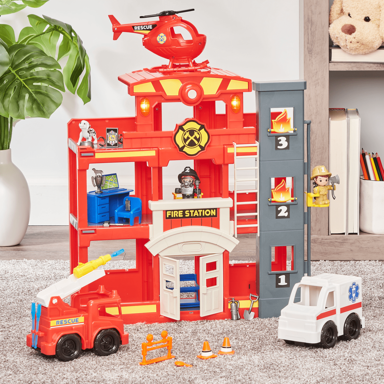 حارب الحرائق وقم بعمليات إنقاذ جريئة مع مجموعة اللعب المليئة بالإثارة هذه بثلاثة مستويات من اللعب! تحتوي هذه المجموعة على كل ما تحتاجه لإنشاء حكايات إنقاذ ملحمية. يتمتع شخصيتا رجل الإطفاء برأسين وذراعين قابلين للتعديل، وهناك أيضًا شخصية كلب إطفاء! تحتوي طائرة الهليكوبتر الإنقاذية على مراوح تدور وتناسب مهبط الطائرات العمودية في الأعلى. تتضمن عربة الإطفاء ذات العجلات الحرة سلمًا يمكن رفعه وخفضه وخراطيم مدفع المياه التي تطلق المقذوفات كلما ضغطت على الزر! وجه خرطوم مدفع المياه نحو اللهب المنبثق لإطفاء الحريق، أو اقلب اللهب يدويًا لأعلى ولأسفل. تشمل الميزات المثيرة الأخرى إنذار حريق يضيء ويرن عند الضغط على الزر، ومصعد لرفع الشخصيات لأعلى ولأسفل مجموعة اللعب، وأبواب تفتح وتغلق، وسلم لربطه بالمبنى، ومكتب إرسال والمزيد! تشمل الملحقات الإضافية المنبثقة أدوات إطفاء الحرائق القابلة للتركيب مثل مطفأة الحريق وفأس إطفاء الحرائق والمجرفة والمزيد. إنه مقر الإنقاذ النهائي! مع ألعاب Tiny Kiddom، أنت دائمًا بطل!