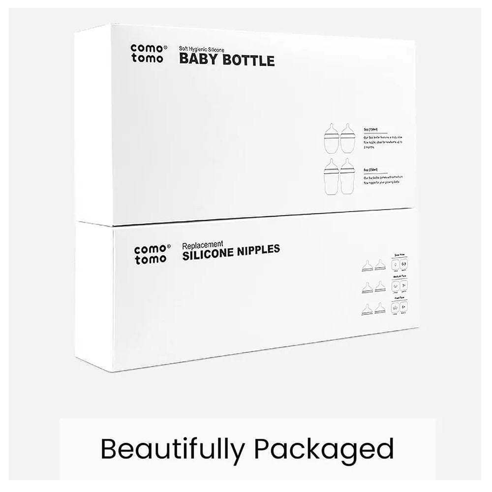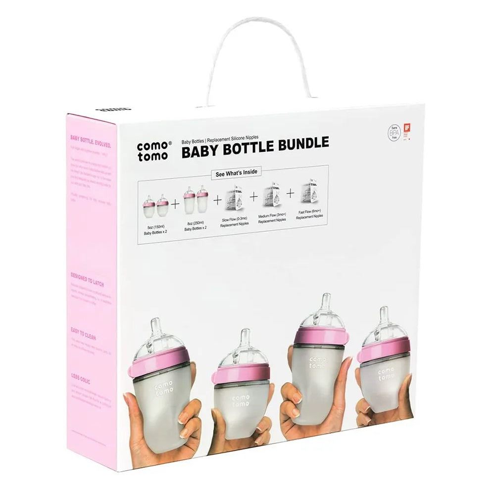 • Our Comotomo Baby Bottle Bundle includes two 5oz. bottles, two 8oz. bottles, and a package each of our slow flow, medium flow, and fast flow replacement nipples. (Replacement nipple packages come with two nipples each.)