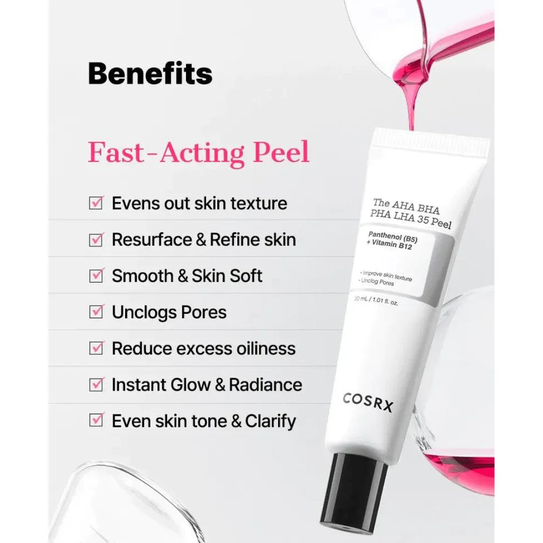 Powered by 35% multi-acids, the COSRX The AHA, BHA, PHA and LHA 35 Peel is a potent exfoliator developed to buff away dead skin cells for a radiant, renewed appearance.