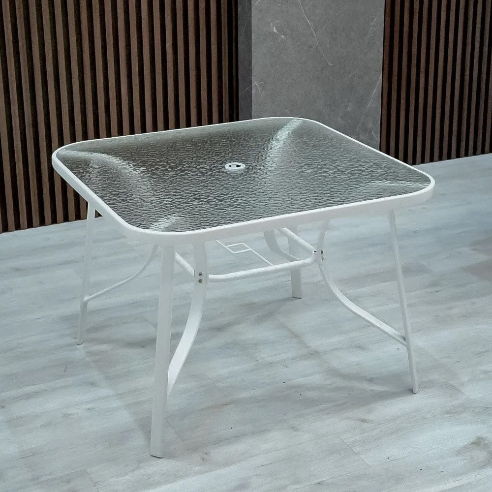 Table Delight: The square table offers ample space for gatherings. Its steel frame ensures unwavering support, while the 5mm water weave glass top adds an elegant touch.