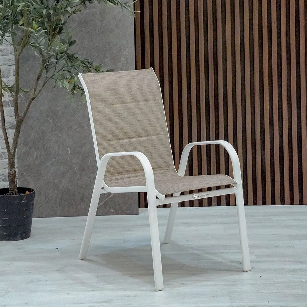 Introducing the EVE Texteline Dining Set 4+1 in White – a symphony of comfort, style, and durability that transforms your outdoor space into a haven of relaxation and sophistication.