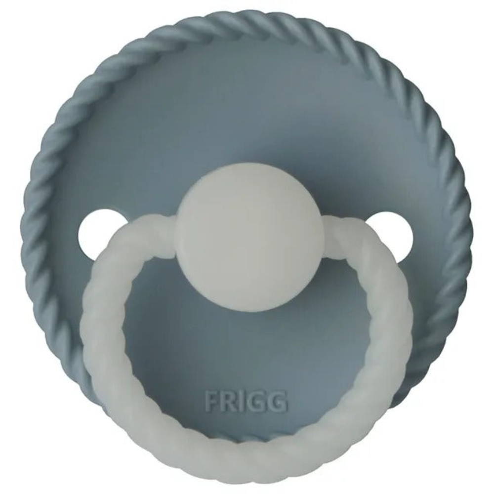 FRIGG Night pacifier with a glow-in-the-dark function. The handle and knob will glow in the dark and solve the challenge of finding and placing your baby's pacifier in the middle of the night. The glow-in-the-night feature is softly bright and won't harm your baby's eyes and you can easily find the pacifier without turning on the lights. , , FRIGG Night pacifier is 100% designed and manufactured in Denmark as the only pacifier brand in the world. How to make the FRIGG Night pacifier glow Hold the pacifier in light to activate the glow function., , Care Instructions - Place the pacifier in a bowl, and pour boiling water overtop. Let sit for 3-5 minutes. Do not submerge for longer than 5 minutes. Remove and place on a flat surface to air dry. Do not use sterilizers, microwaves or dishwashers. For optimal safety and hygiene, we recommend discarding your pacifier after 1-2 months of consistent use. Always check your pacifier before use, and discard at first signs of damage or wear.