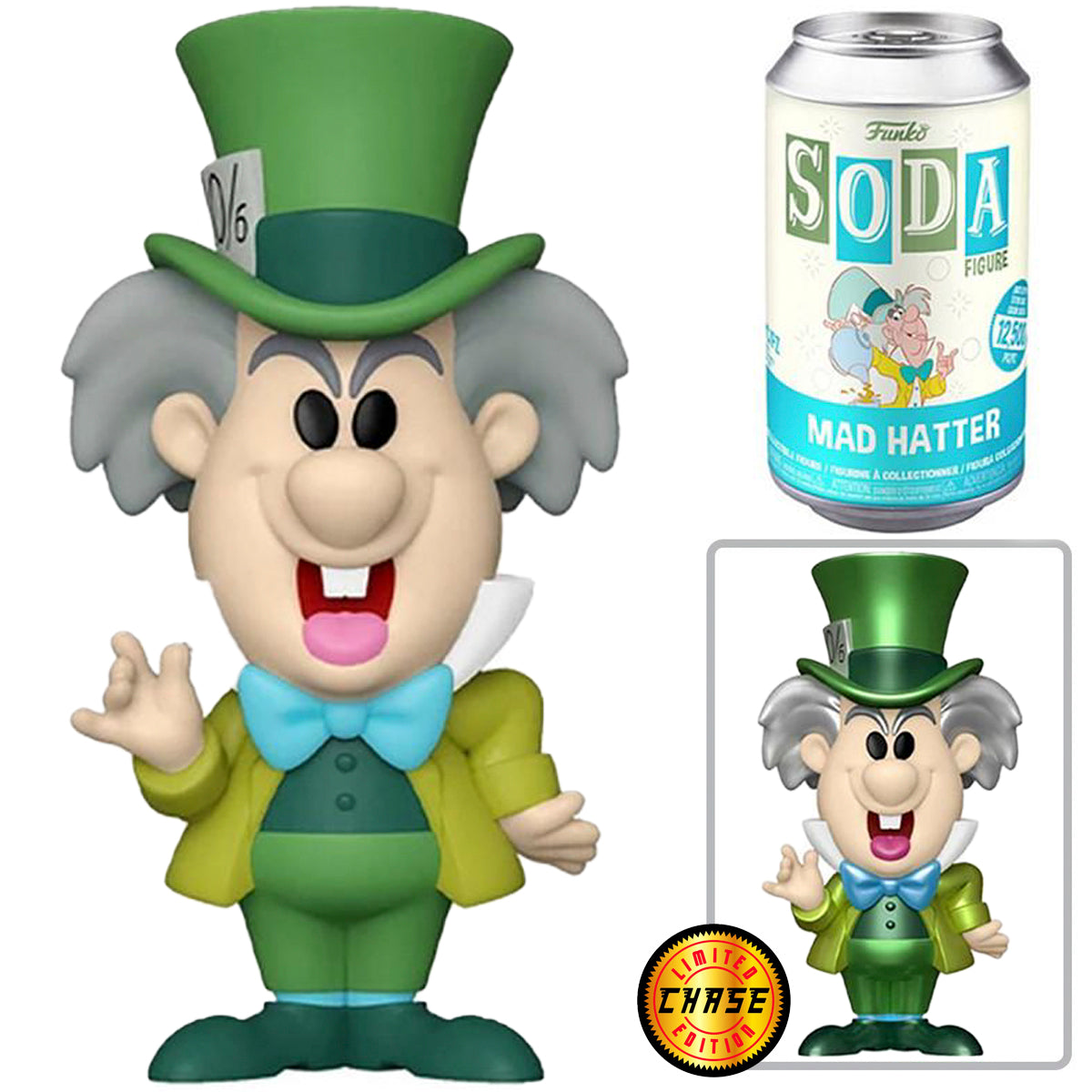 The Mad Hatter from Alice in Wonderland is depicted in this exclusive Vinyl SODA figure with a metallic chase variant, capturing his whimsical and eccentric nature. The design reflects his role as a beloved character, making it a must-have for Disney fans.