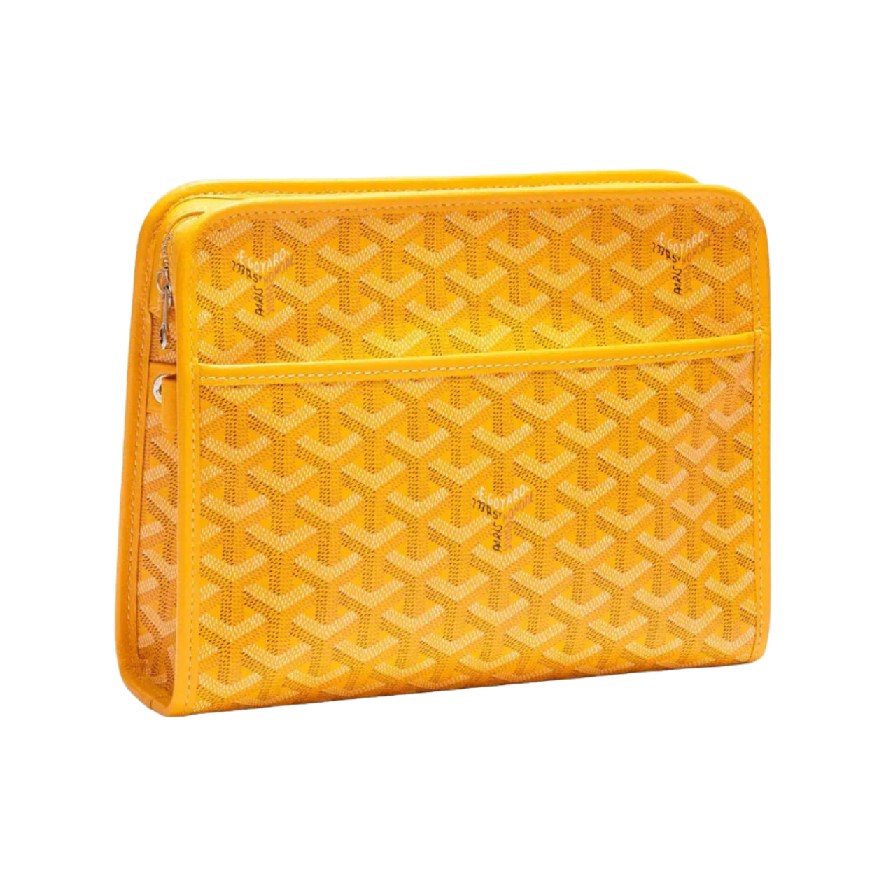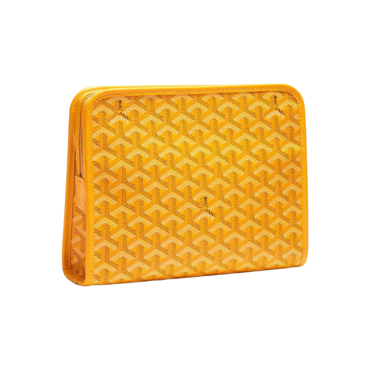 Elevate your travel style with the Goyard Jouvence Toiletry Bag MM Yellow. With the brand's iconic coated canvas and leather accents, this durable, water-resistant toiletry bag seamlessly blends fashion and function. Its roomy main compartment, multiple pockets, and secure zip closure keep your necessities neatly stored and easily accessible. This chic and versatile bag, which features Goyard's signature monogram pattern, is ideal for everyday usage and adventurous trips or even for stylish gifts for fashion enthusiasts. Whether you are a frequent traveler or are simply looking for a designer toiletry bag to enhance your collection, the Goyard Jouvence Toiletry Bag is the ultimate luxury travel accessory.