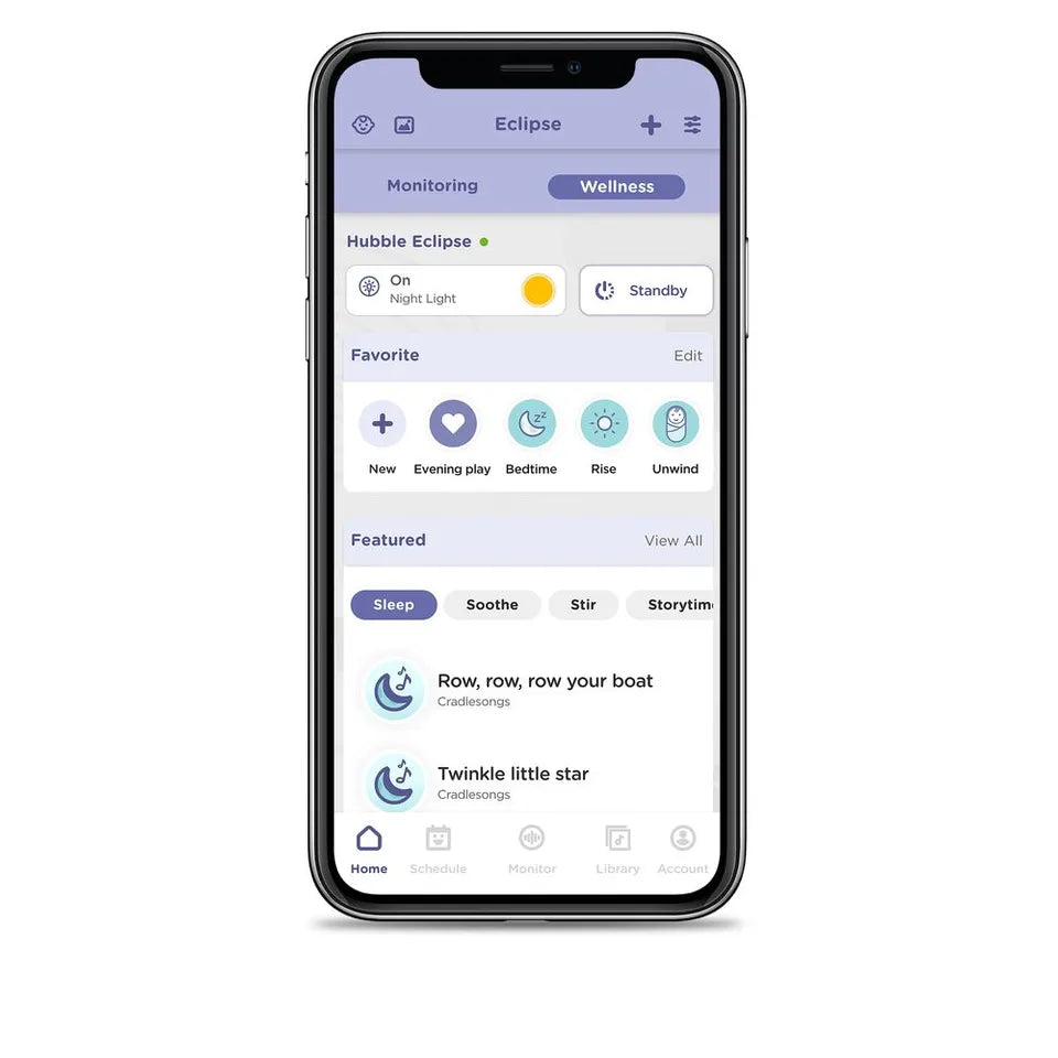 The Hubble Connected Eclipse baby audio monitor is a smart soother featured with 7-colour night light to make it your own gentle and reassuring kids night light. The baby monitor audio only has customisable LED lights that can be adjusted to the desired brightness (or turned off completely) on the hubble baby monitor app. The product is preloaded with soothing nature sounds, lullabies and white noise customised for toddlers and kids. You can also live stream audio content from Hubble store via HubbleClub app. , , With the assistance of night light and soothing sound, you can program Sleep Trainer to your child for tricky transitions: naps, bedtime, and morning. Two-way Audio Monitor supports you to listen and talk to your child from another room through your phone with clear transmission. The HubbleClub App works for with all of the Hubble Connected baby monitors range. Please note that the plug in baby monitor doesn't come with a USB-A wall adapter and this will need to be purchased separately.